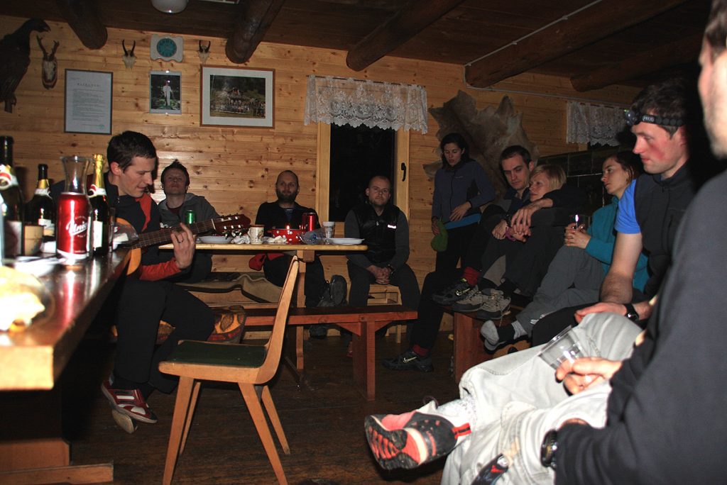 Organizatorji (najbolj zaslužni: Marija Verbuč – Marička z lovskimi zvezami, Anja Lampret – Ančka z umetniško žilico in Sergej Jamnikar – Serđo, knap, ki je za vse) so očitno sklenili skrivni pakt z vremenarji, saj so poskrbeli za jasen vikend in kopno cesto vse do koče. Tako da nam je bila tudi tista obljubljena huda ura hoda in gaženja po snegu s težkimi nahrbtniki prizanesena. Torej, nič s kondicijsko zimsko uverturo. Gamaše in palice so obtičale v nahrbtniku.