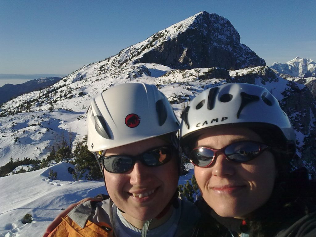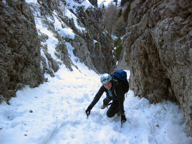 Krenili sva ob 5.00 zjutraj, brez zamujanja. Okoli pol sedmih sva že sopihali proti najinemu cilju. Še dobro, da je bila tema in da sva bili sami, ker sva na poti na veliko lovili ravnotežje na poledeneli cesti in se ob tem pošteno nasmejali. Pri GRS koči sva se malce odžejali in se podali na lov za najino grapo. Z orientacijo nisva imeli težav (pa še Alen naju je dobro opremil s skicami) tako da sva se lahko hitro lotili dela. Malo pred deveto sva se že nastavljali sončku in se v miru posvetili čokoladicam in uživanju ob prekrasnih razgledih na okolico, ki se je počasi prebujala v toplo zimsko jutro. Veseli in polni energije sva se odpravili proti dolini…in prišli pravi čas vsaka na svoj konec. Hm, na »pir« nama ni uspelo iti, pa sva si obljubili, da greva takoj, ko se vidiva in pošteno nazdraviva ter skujeva nove načrte.