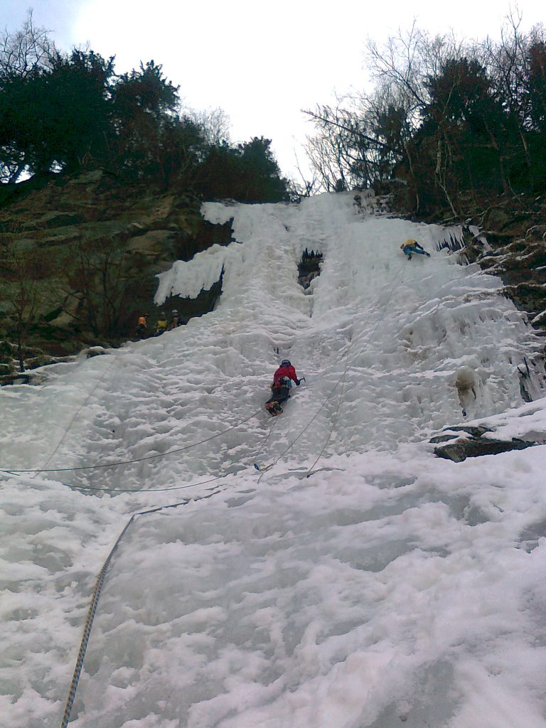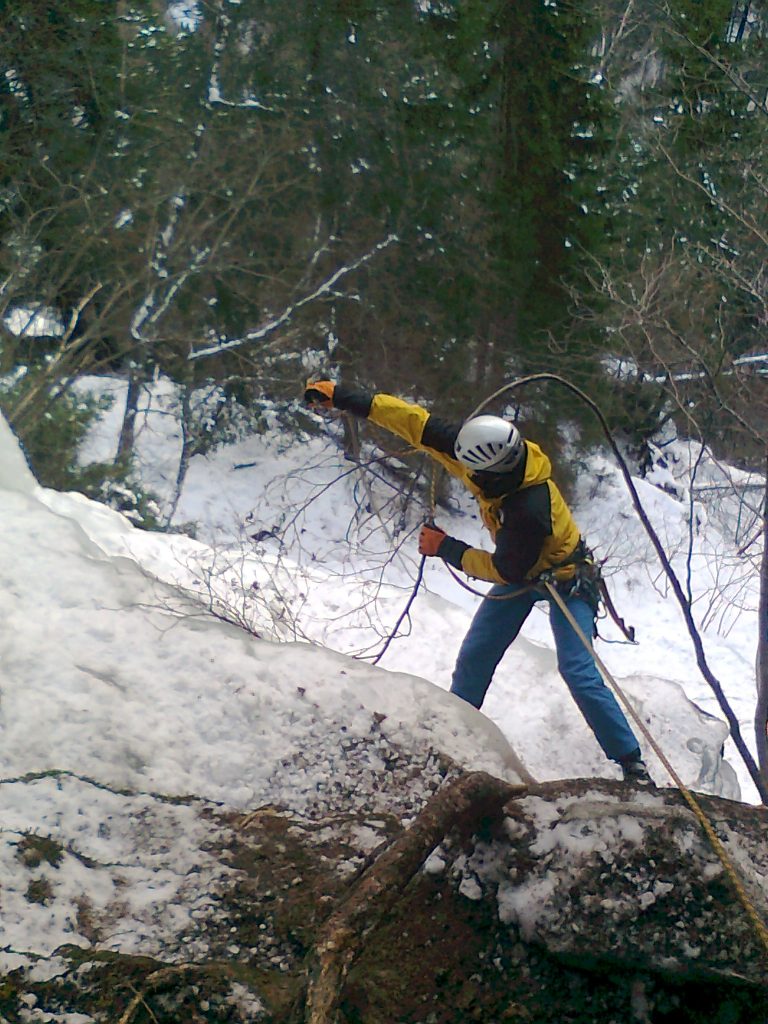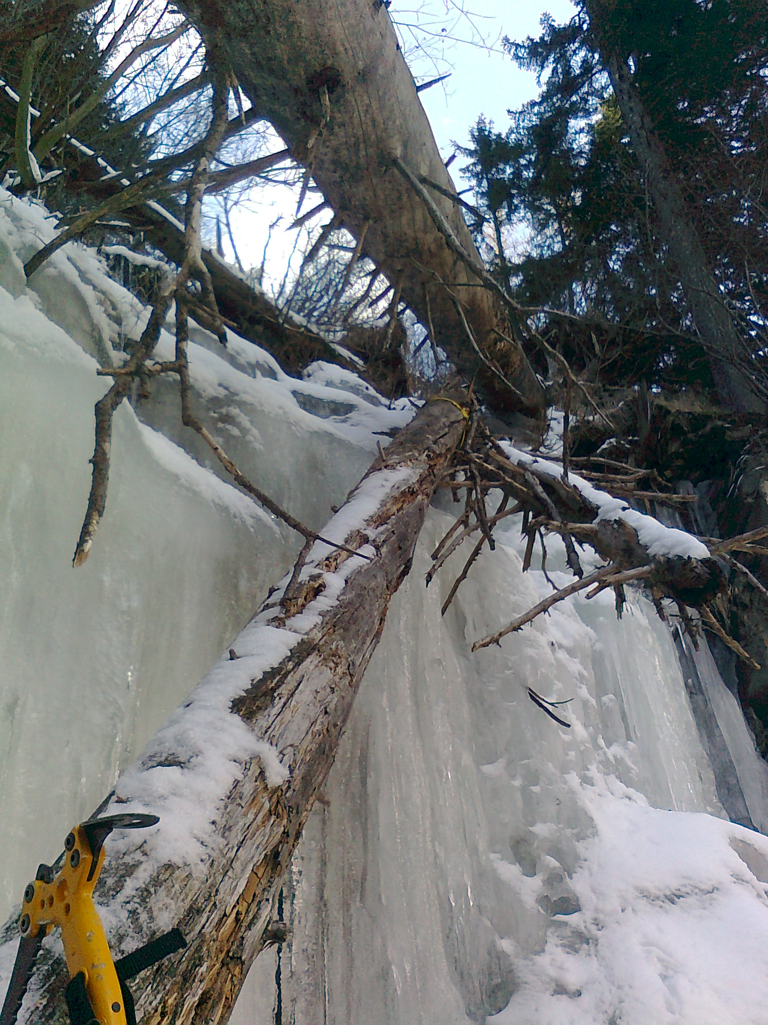 Nič zato, splezamo najprej tega, potem pa v iskanje drugega. Slapovi so še v dokaj dobrem stanju. Splezaš ga tam, kjer se na oko vidi, da je led debelejši. Ker so že dostikrat preplezani, lahko s cepini kar zatikaš v luknje in varčuješ z močjo.