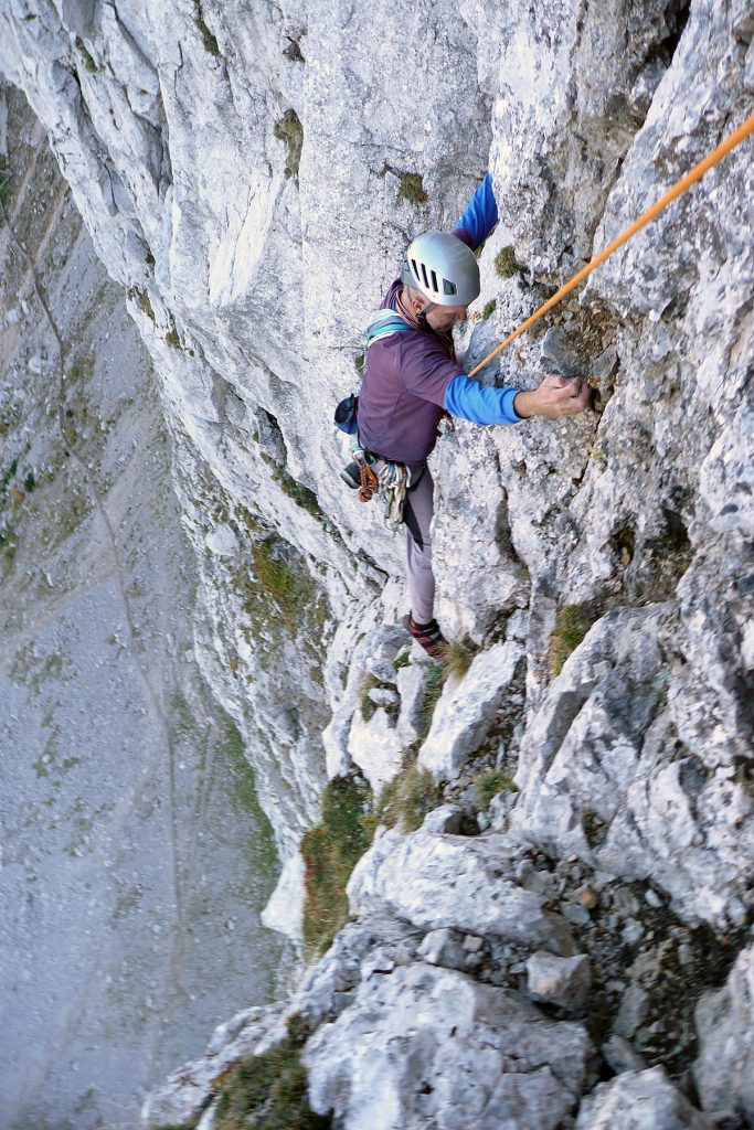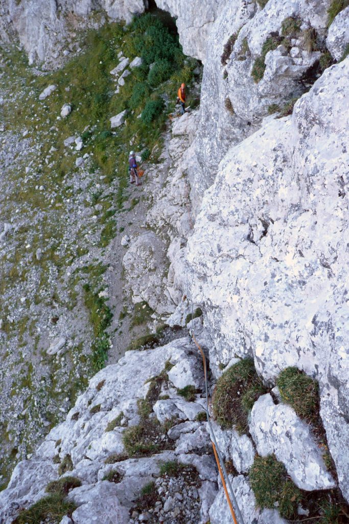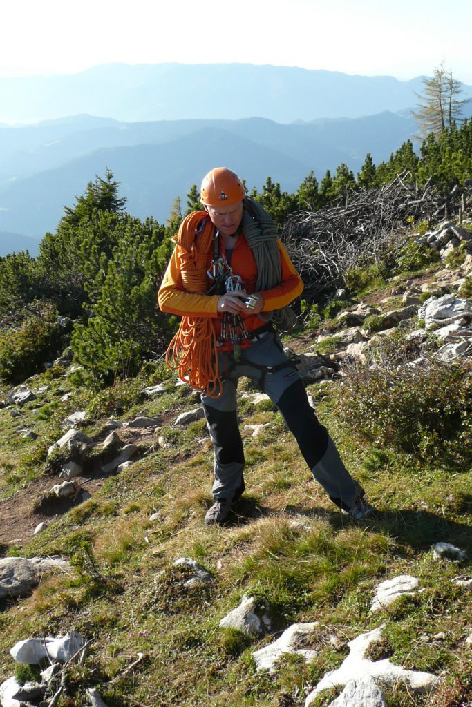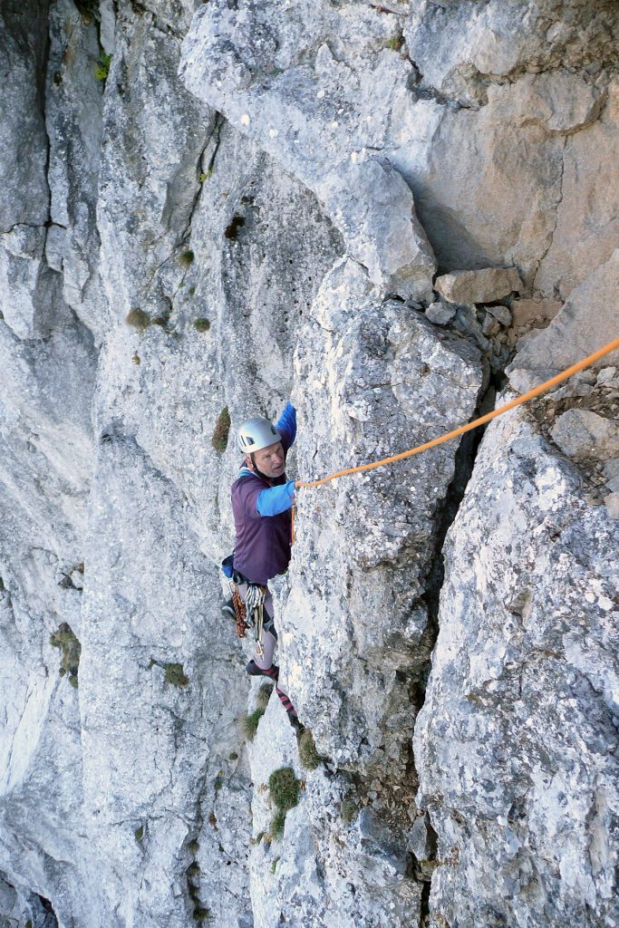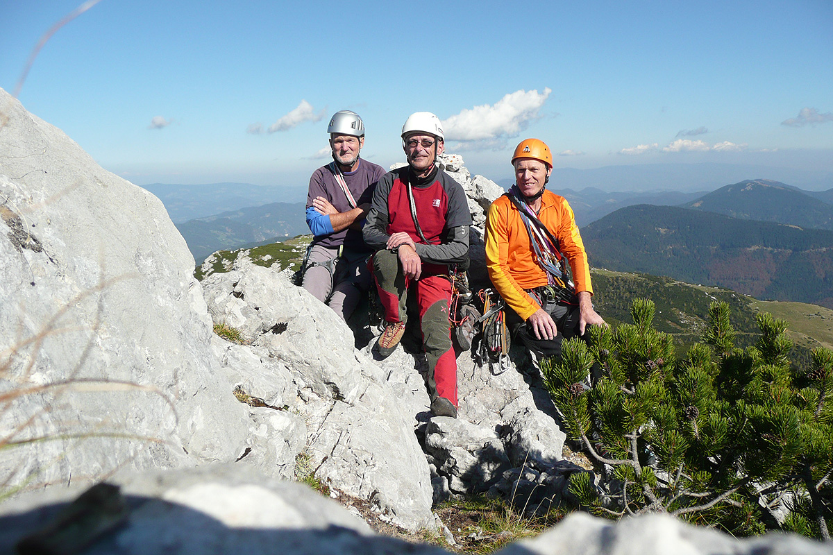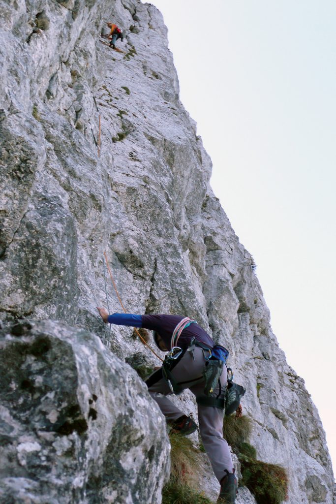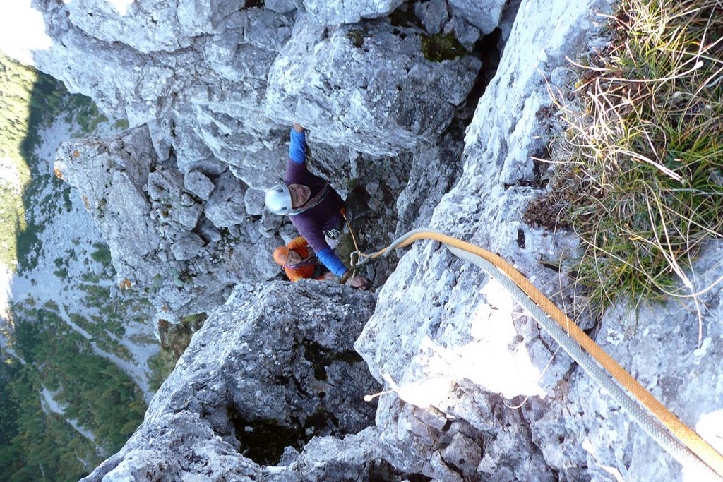 Pa se zopet kmalu zamenjata. Proti “Knežjemu kamnu” se zopet zažene Mijo. Potem pa dolgo nič. Sva s Stanetom pomislila, da se je dal že “ustoličit”, ko se zasliši odmev “VARUJEM”. Pa se je kmalu pokazalo. Okoli rogljev in macesnov vrv ne teče najbolj gladko. Še zadnji raztežaj v direktnem izstopu – pač bolj pokonci in že smo na sončku.