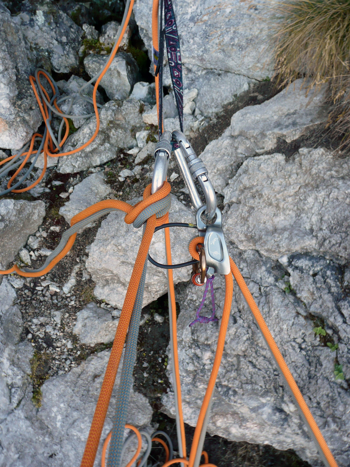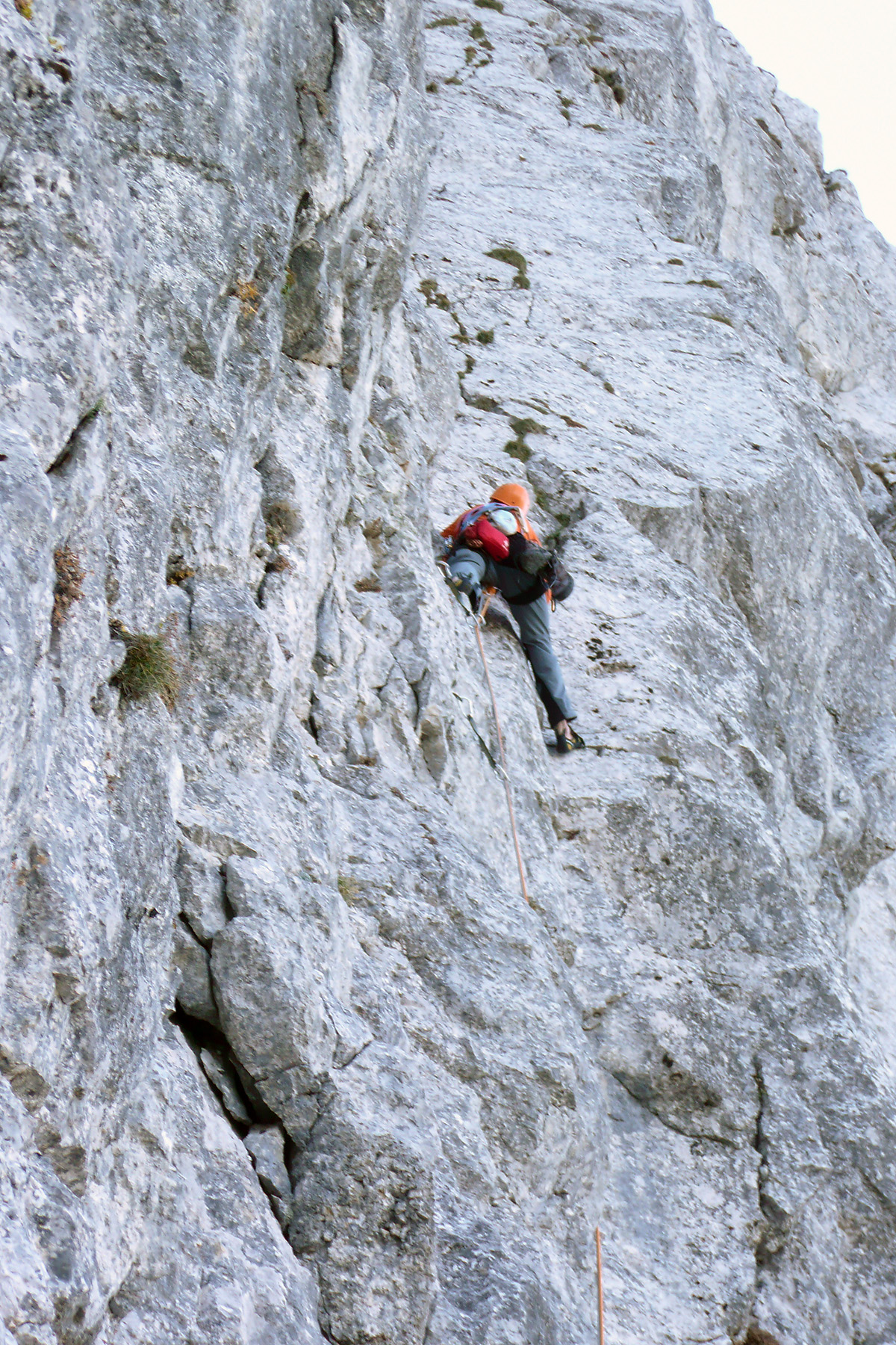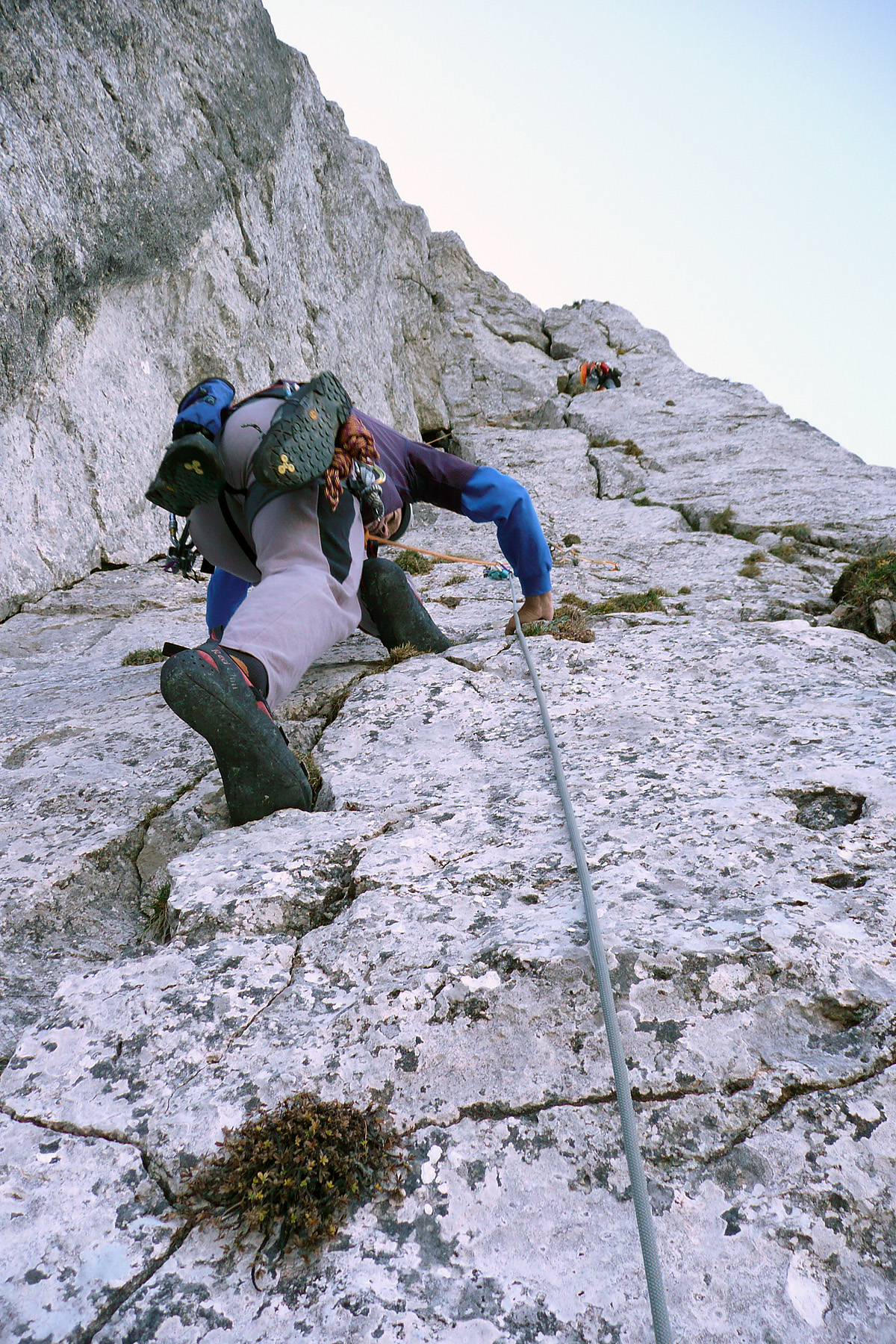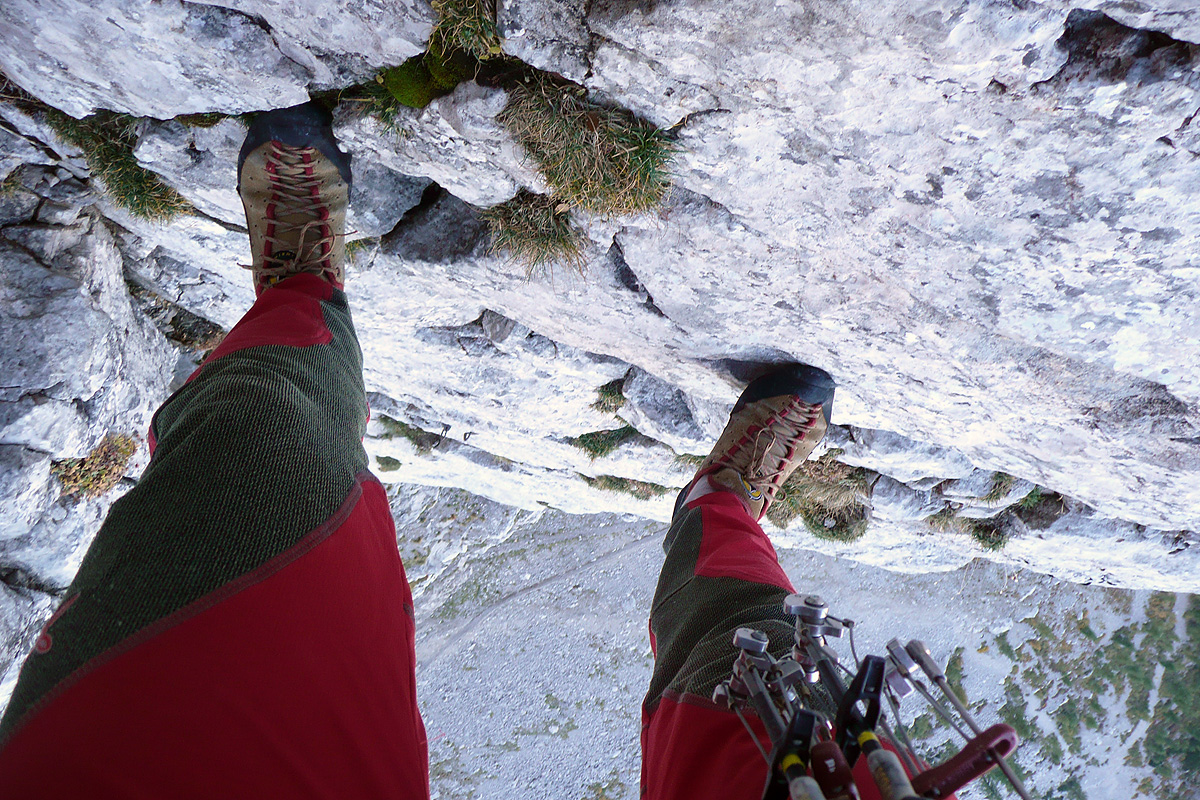 Pa se zopet kmalu zamenjata. Proti “Knežjemu kamnu” se zopet zažene Mijo. Potem pa dolgo nič. Sva s Stanetom pomislila, da se je dal že “ustoličit”, ko se zasliši odmev “VARUJEM”. Pa se je kmalu pokazalo. Okoli rogljev in macesnov vrv ne teče najbolj gladko. Še zadnji raztežaj v direktnem izstopu – pač bolj pokonci in že smo na sončku.