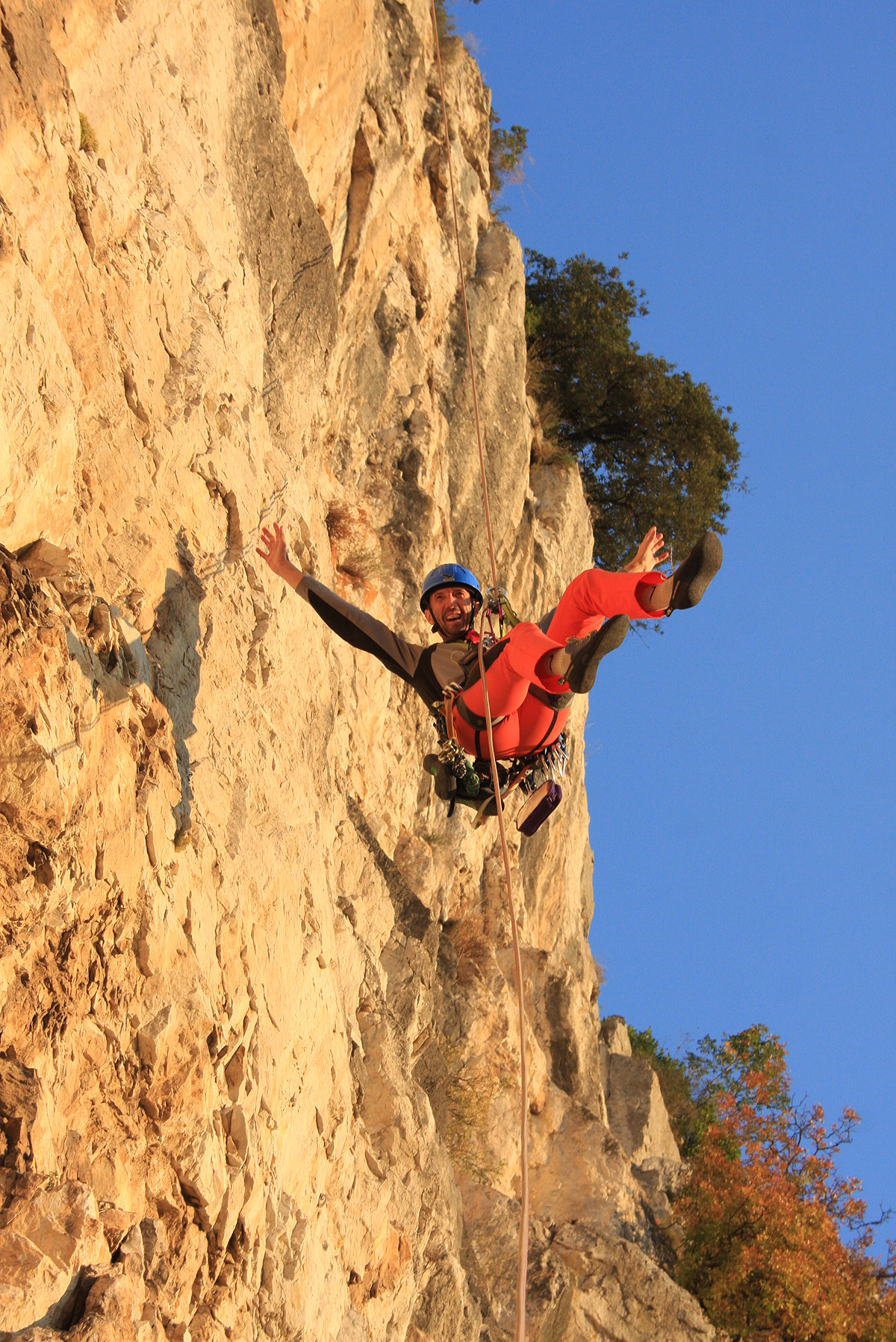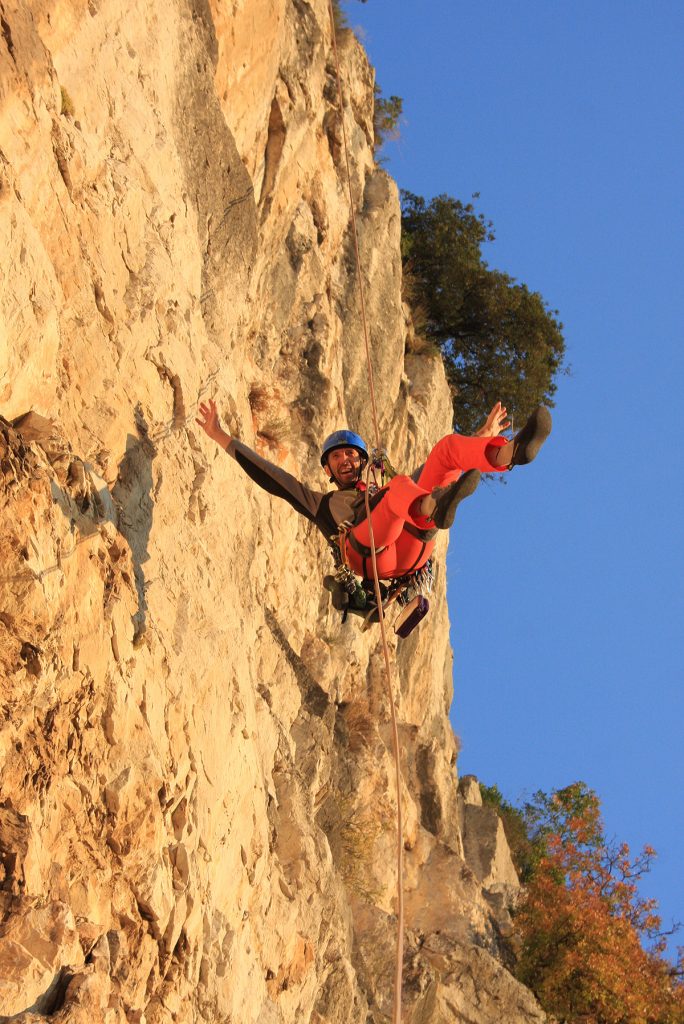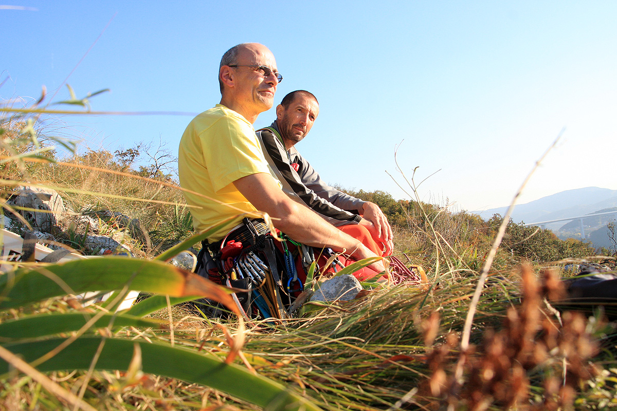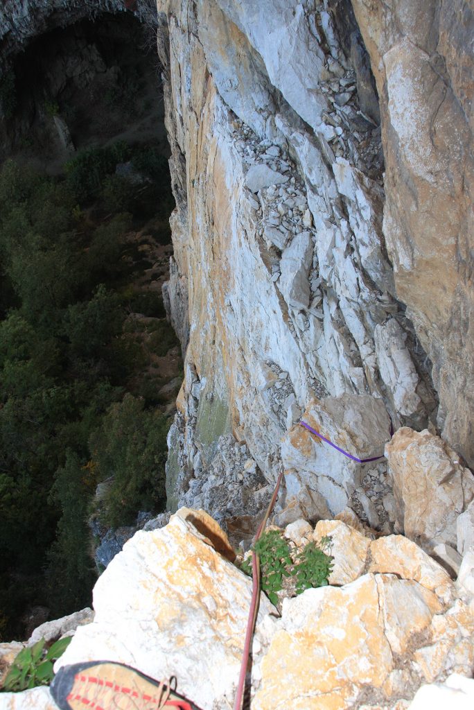 Privoščiva si malo daljši oddih na sončku s pogledom na morje in Mijo kljub razpršenim meglicam napravi par fotografij, seveda z okolico pod nama. Sedaj sledi samo še poslastica dneva – večraztežajno lebdenje v zraku nad Ospom, seveda na vrvi. Kdor še ni okusil to, sploh ne ve kaj je pravi »obzajl«. Tako sem verjetno za letos zaključil z večraztežajnimi kopnimi smermi.