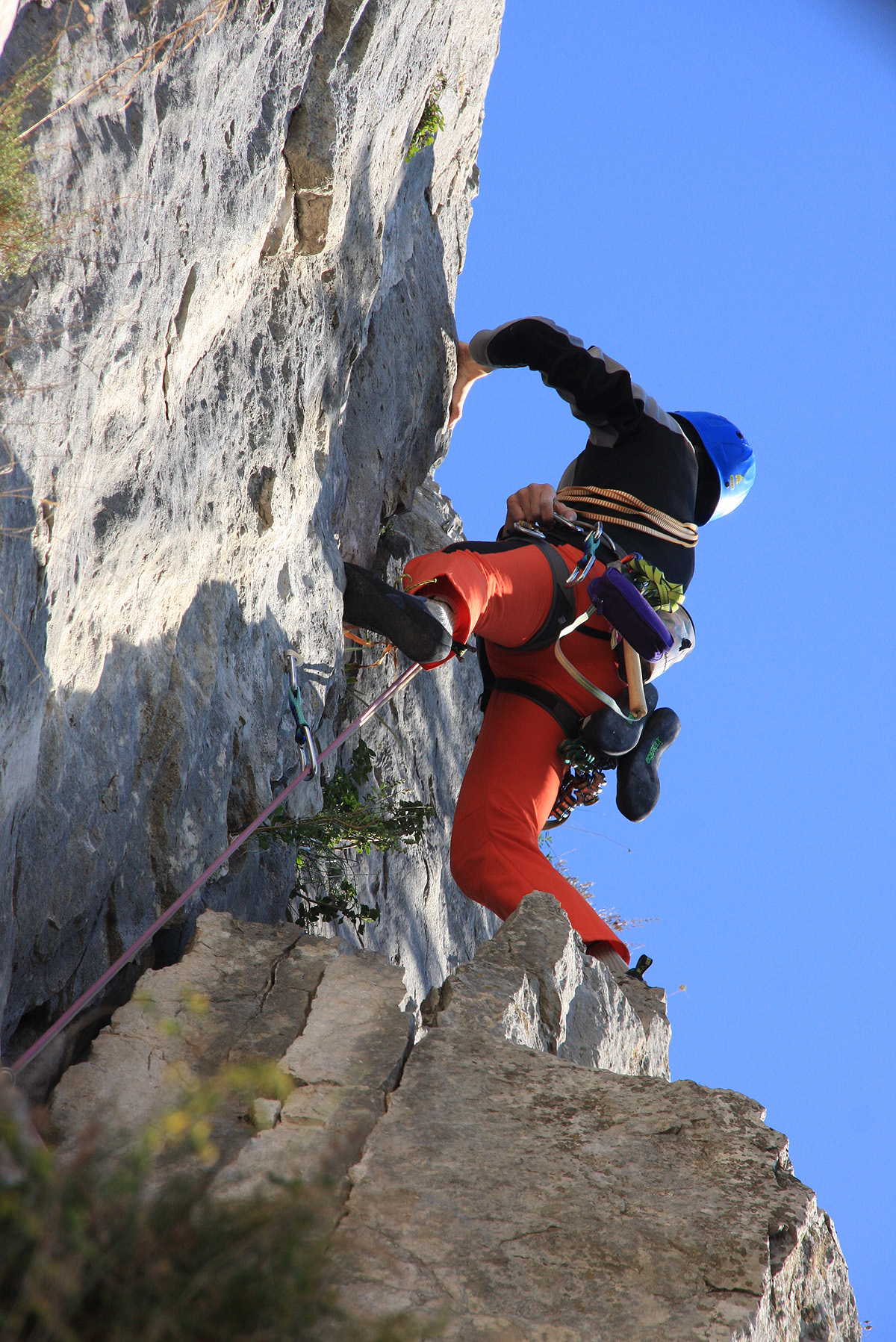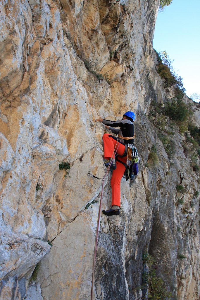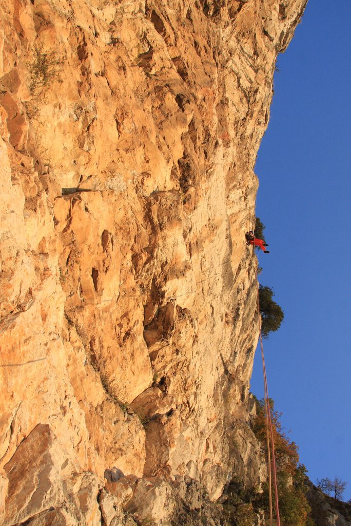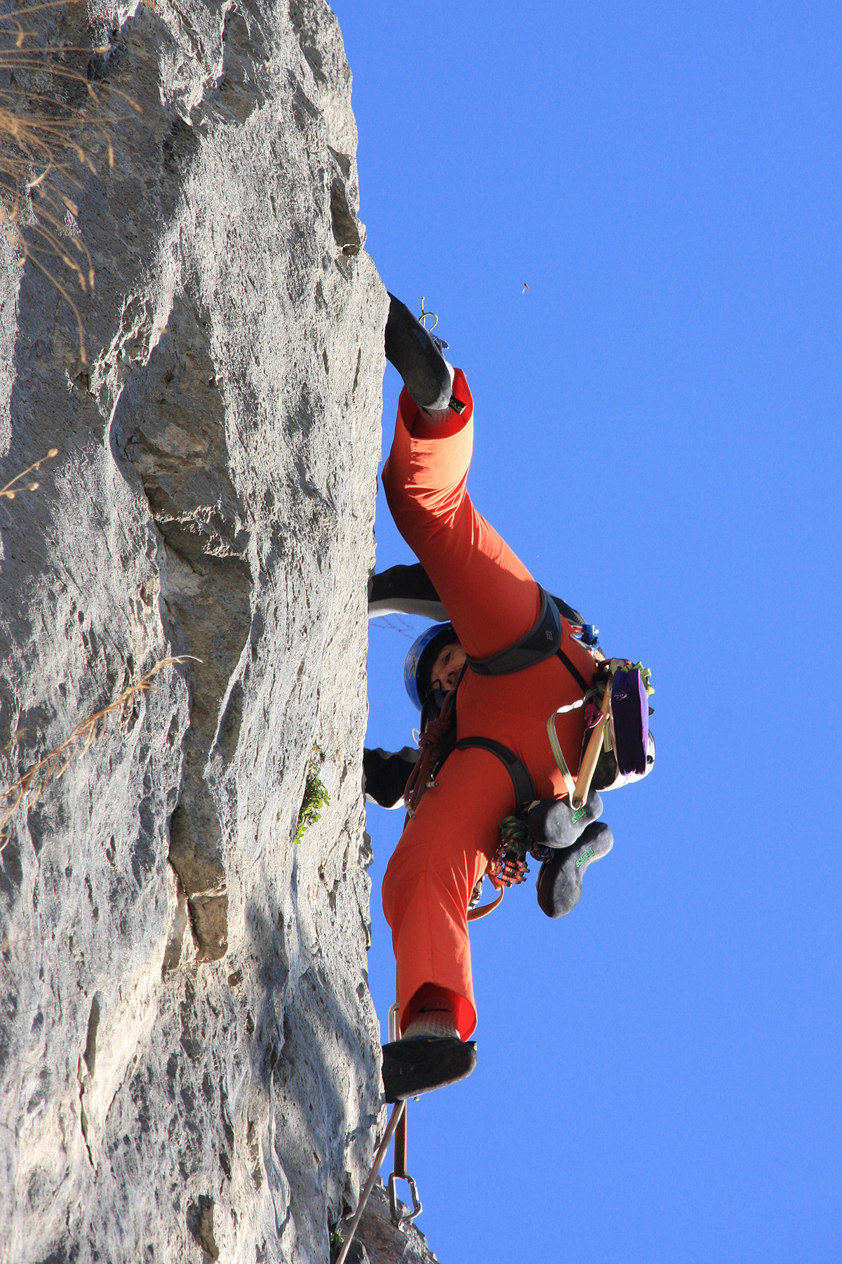 V sredo je Mijo pri meni že pred sedmo, zunaj kaže minus sedem stopinj. Le kam se midva odpravljava .. V Ljubljani odloživa dva, ki morata danes delati, midva pa lepo naprej proti Primorski. Končno se prebijeva iz Ljubljanske megle, temperatura pa le počasi raste. V Kozini je že pet stopinj seveda v plusu. Da ne bi bila prekmalu v Ospu, se ustaviva še na toplem napitku na črnem Kalu. Na parkirišču v Ospu je že prijetnih deset stopinj, prav tako v plus. Naloživa nahrbtnika na rame in hop že hitiva pod steno. Ugotoviva, da bi bilo pametno naslednjič prinesti s seboj škarje za trnje in tudi kakšna manjša žaga bi na dostopu prišla prav. Pod steno preloživa vso plezalno opremo na sebe, pripraviva sidrišče, kar na drevesu in že se Mijo požene v prvi raztežaj, ki pa ga je bilo potrebno, kar se da previdno preplezati zaradi naloženih skal in podora v njegovem izteku. Ker je v tem raztežaju samo en svedrovec je Mijo opremil nevarnejše skoke še z nekaj metulji. No če se nisva ogrela v prvem, sva se zagotovo v drugem raztežaju. Tu pa je že malo težje, svedrovci so, a ne tako blizu kot bi si jih želel.