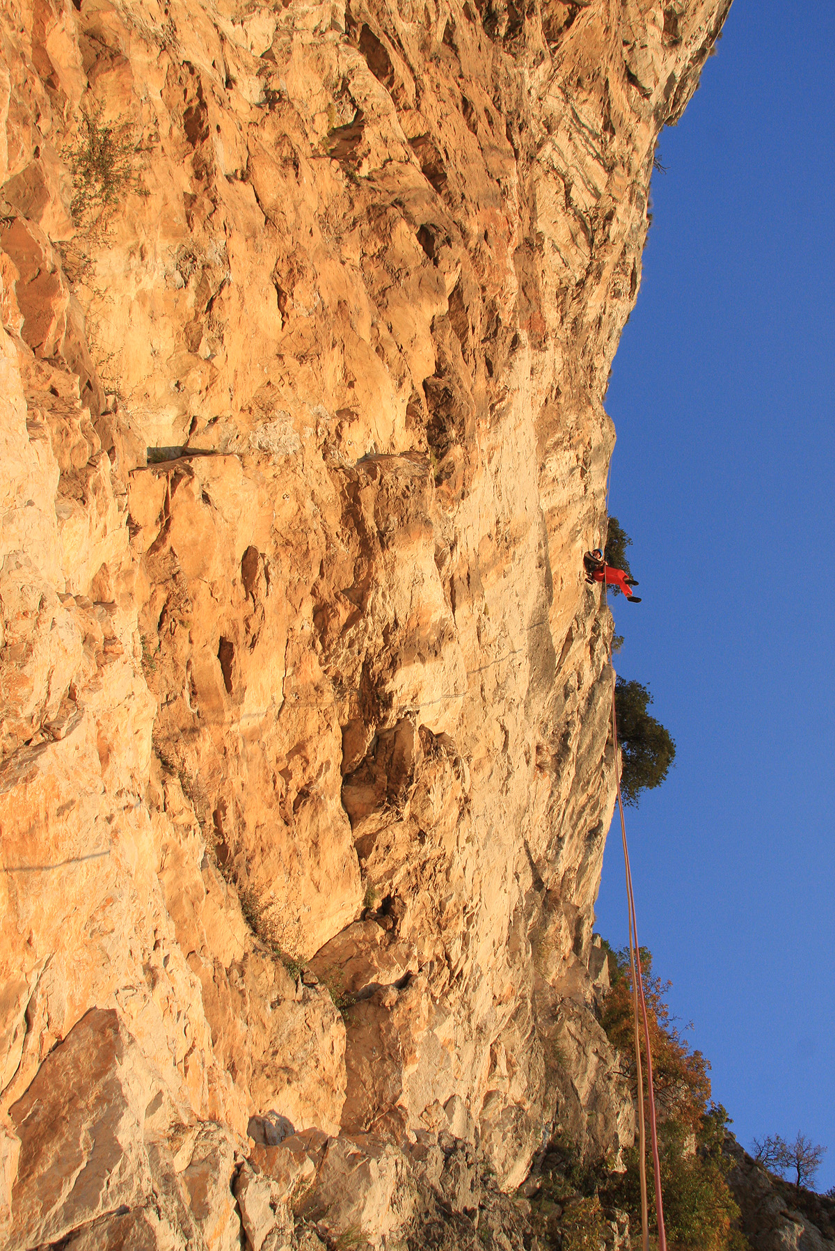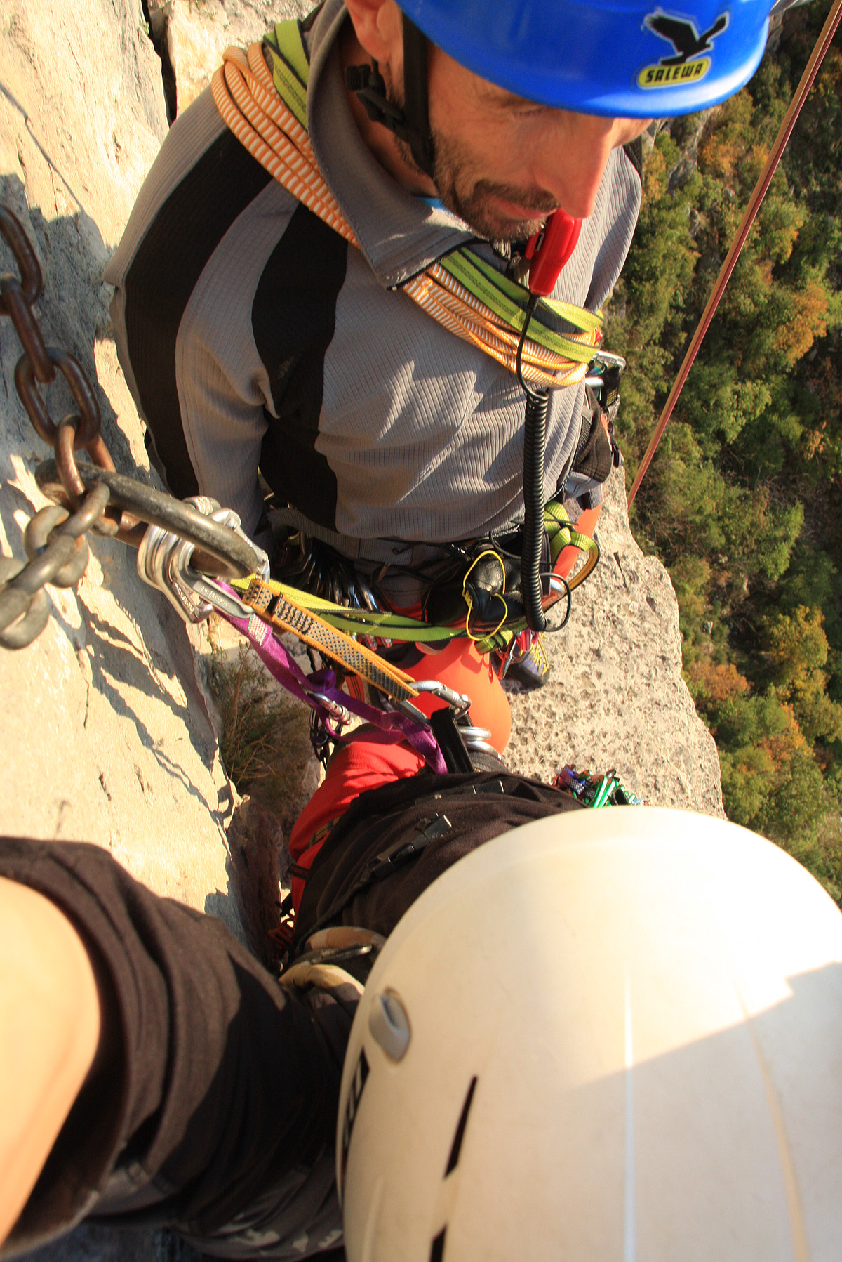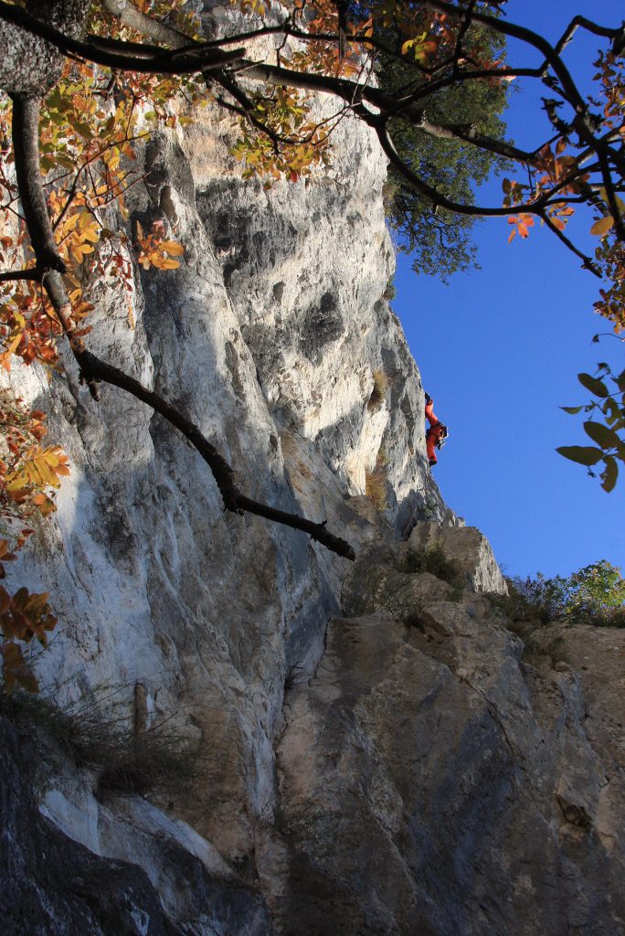 Zato pa je poplačan trud na sidrišču, ki si ga lahko urediš kar na drevesu in lepo čakaš na soplezalca. Naslednji raztežaj je bil zelo gladek, pa ne vem ali zaradi števila plezalcev, ki plezajo to smer ali pa temperatura ni več primerna. Ampak kjer je volja je tudi moč, pa sva priplezala na sonček. Zadnji raztežaj je morda za nijanso lažji, samo na izstopu bi si človek želel kakšno »šalco« za izstop iz smeri, potem bi bilo že kičasto.