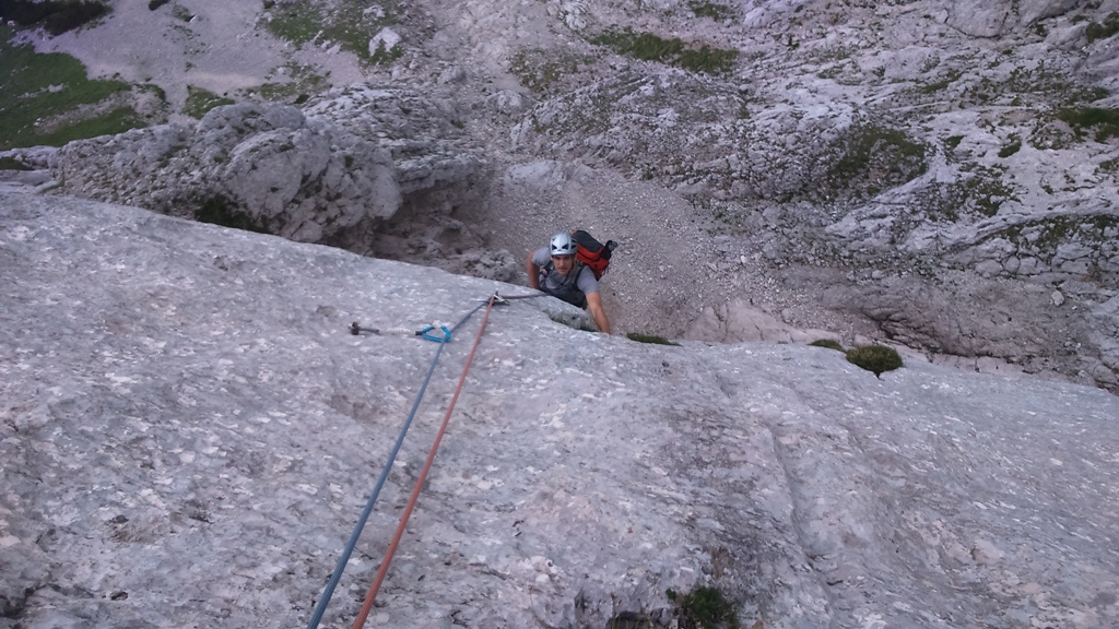 Tudi z Juretom sva sobotni dan preživela v Planjavi. V jugovzhodni steni, ovinek pred Rokom in Matejem. Ampak to smo ugotovili šele na zasluženem pivu na koči na Kamniškem sedlu.