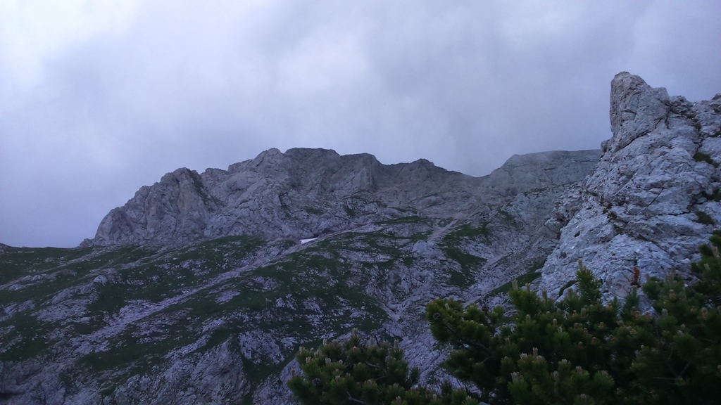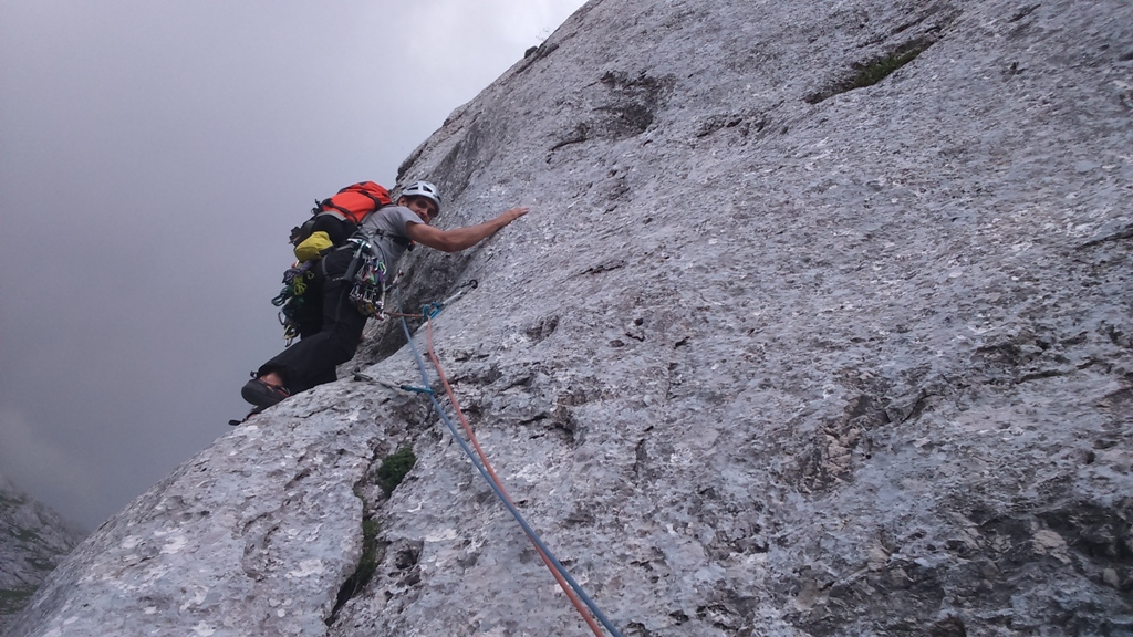Čez travnik in borovce sva odšla proti naslednji smeri Zlatolaski. Ta je malo težja, ravno tako dobro navrtana čez plate. Orientacijsko sva prvi del smeri izbrala malo po svoje, v ključnem delu, kjer se začne plezanje čez plošče pa sva sledila svedrovcem. Smer ponuja dva raztežaja lepega plezanja po kompaktni skali. Na koncu smeri sva pomalicala in si ogledovala še tretjo smer Sivo Upanje, a sivo nebo ni dalo več upanja še za eno smer ampak za sestop proti koči.