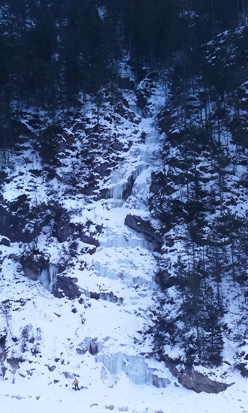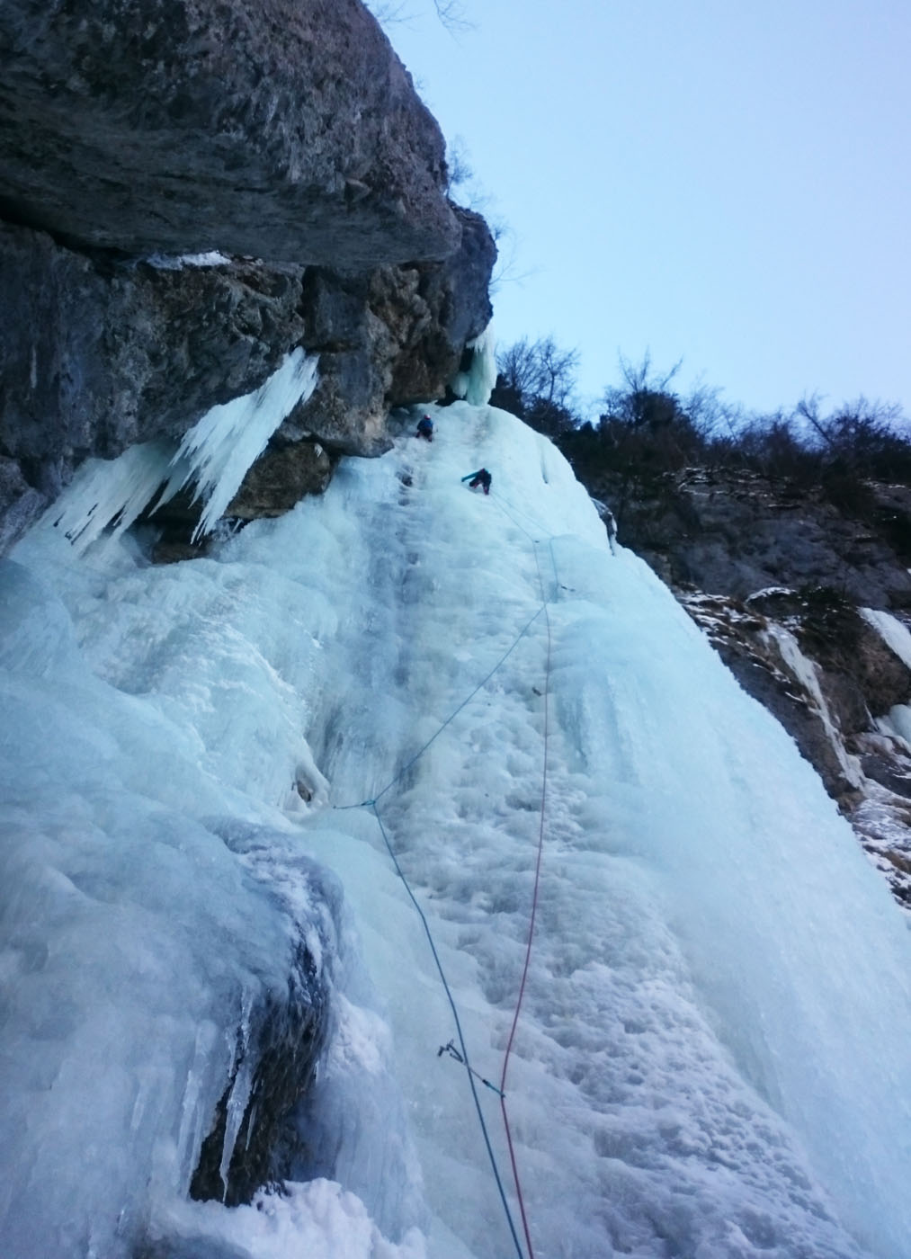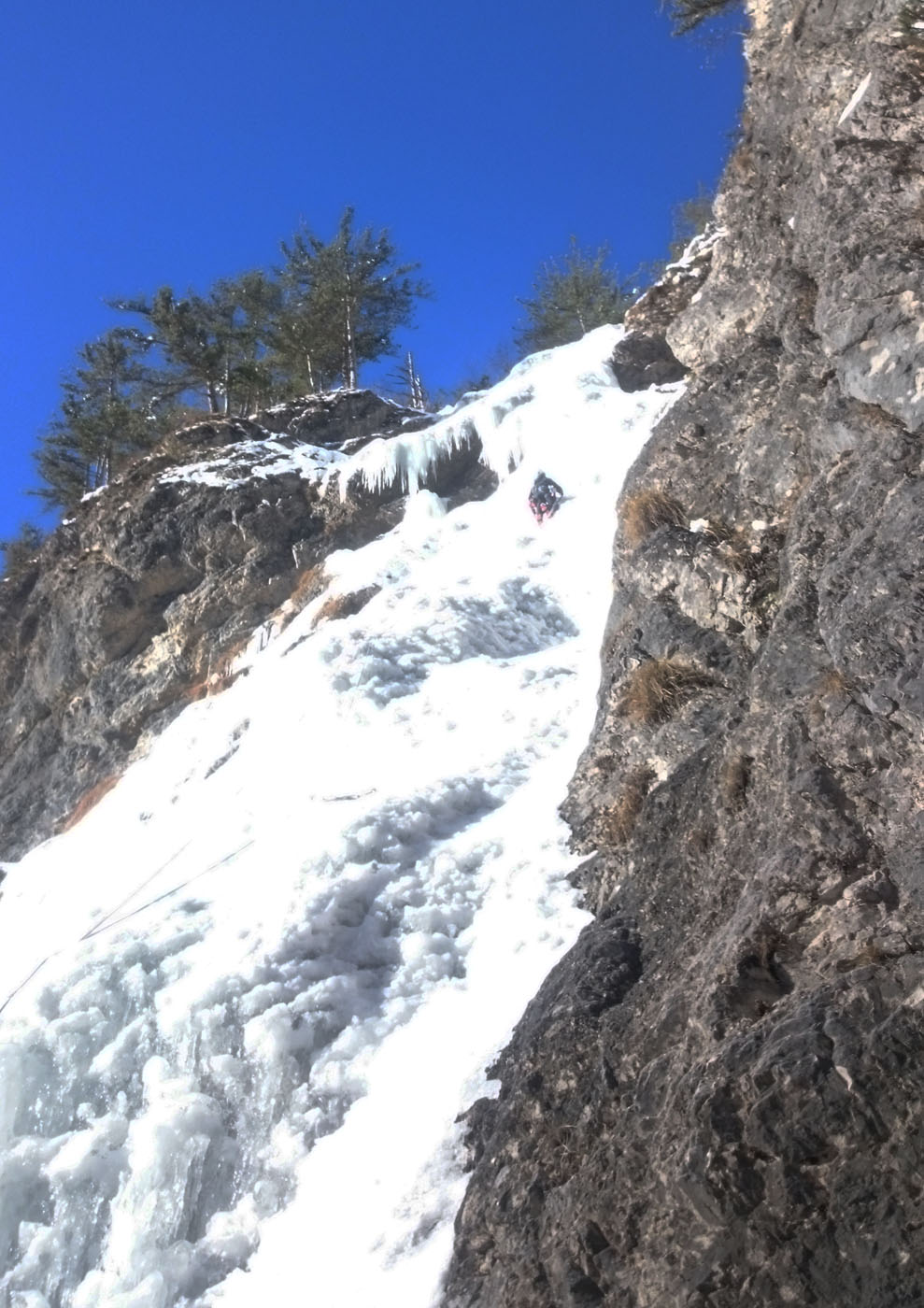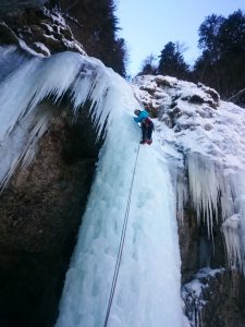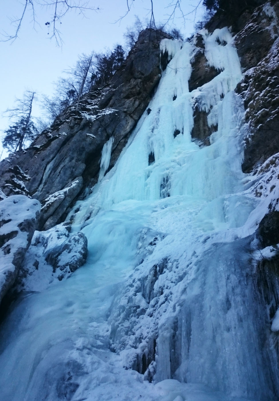 S Tanjo sva se ta vikend odpravila na Primorsko (seveda v gorski del 🙂 ) in na Gorenjsko plezat ledne slapove. V Logu pod Mangrtom sva v soboto splezala prvi del Levega slapa pod belo skalo (WI3, 100m). Slap sva izbrala zato, ker je eden redkih Slovenskih slapov, ki je na soncu, tako da sva vsaj prvi del dneva preživela na toplem zimskem sončku. Šla sva še pod zgornji del slapu, kjer pa je manjkala vstopna sveča. Po sestopu sva ob cesti v smeri Možnice splezala še Kaskade-desni krak (WI2, 110m).