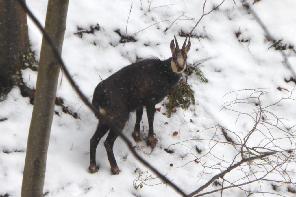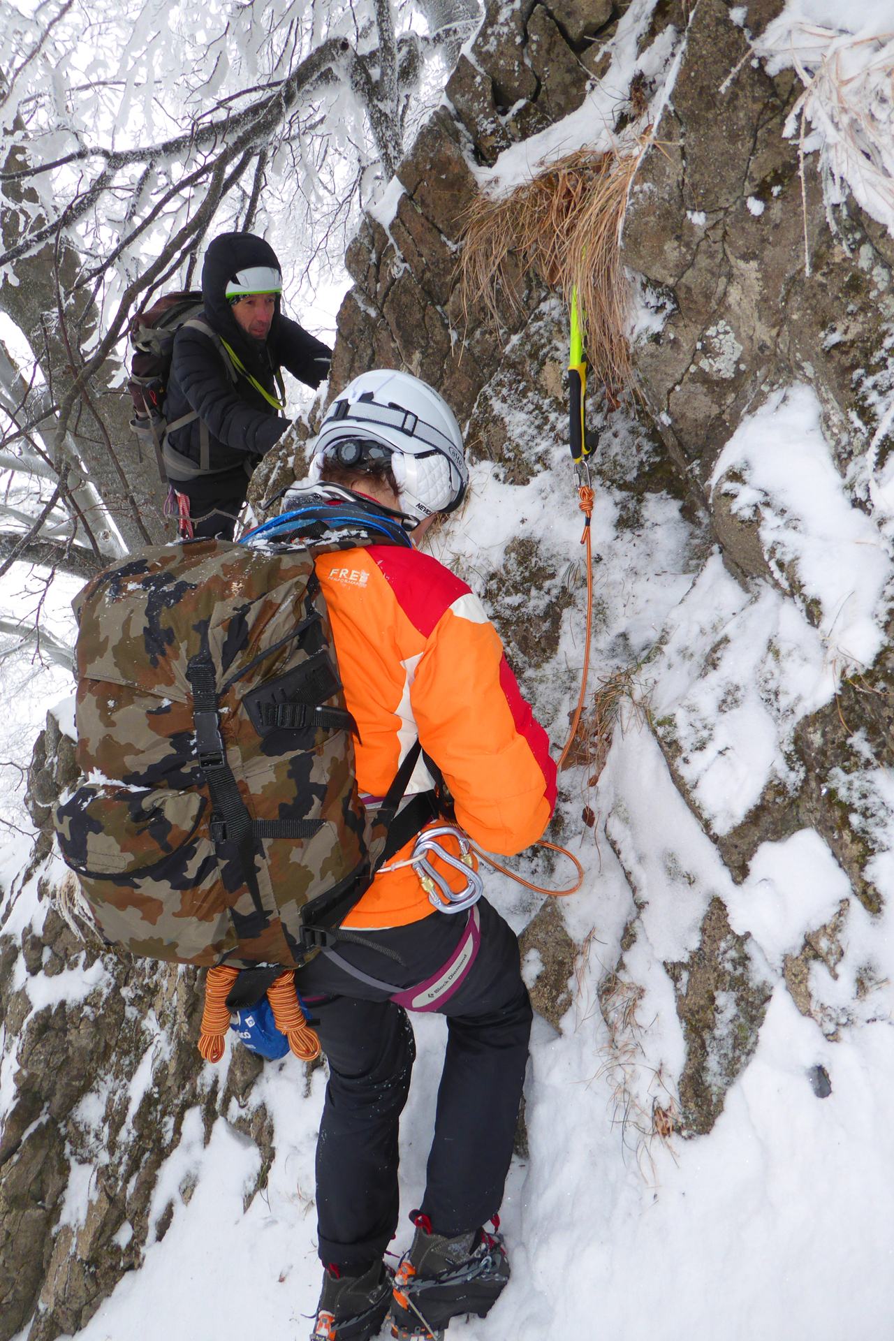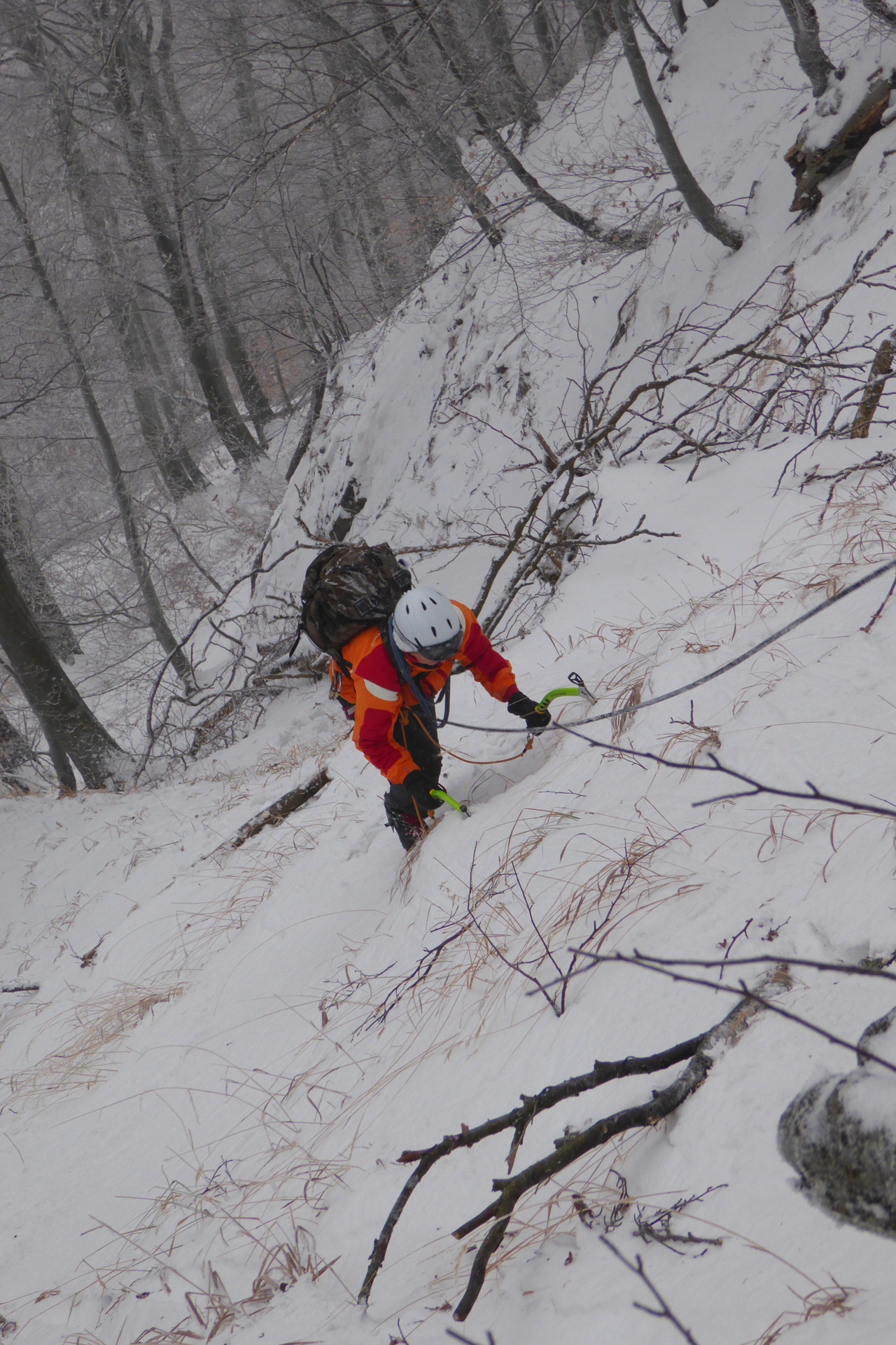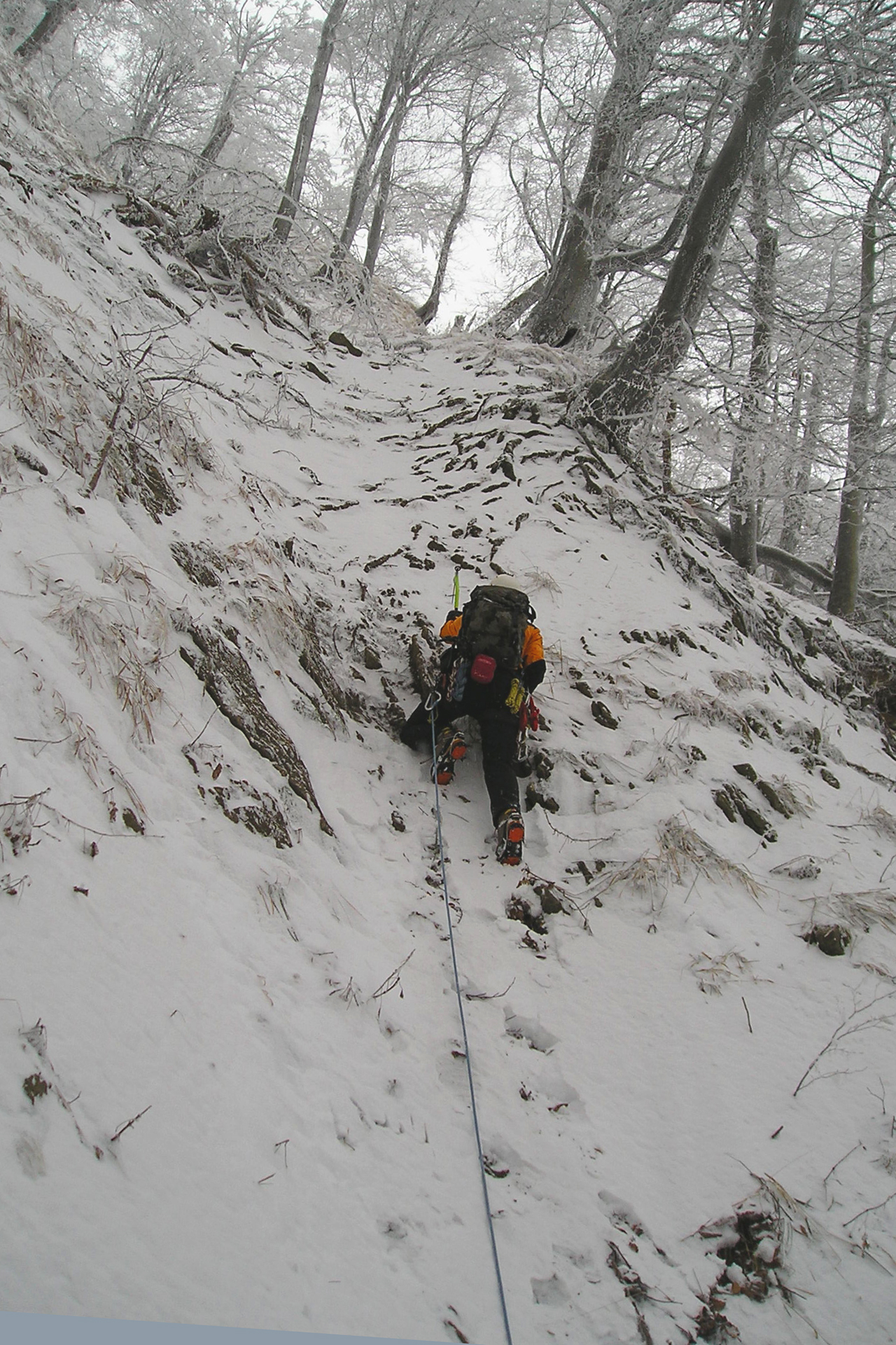Po pohodni poti, ki poteka med mogočnimi bukvami, hodimo pbl. pol ure, potem pa krenemo v levo. V gozdu skoraj ni snega, tako da je naše napredovanje bolj podobno okopavanju, oz. vrtnarjenju kot pravi Mijo. Dostopimo do prve grape in se »zagrizemo« v strmino. Kaj kmalu pa naletimo na strm del s puhastim snegom in z gladkimi skalami. Mijo reče – teren je prenevaren, navezati se bo potrebno. Na edini kapitalni bukvi (2 gurtni sta komaj zadoščali) si naredimo sidrišče in Mijo gre v vodstvo. Napreduje počasi, primernih mest za varovanje sploh ni, k sreči najde nekaj korenin ki gledajo iz skal in nato podrto drevo za sidrišče.