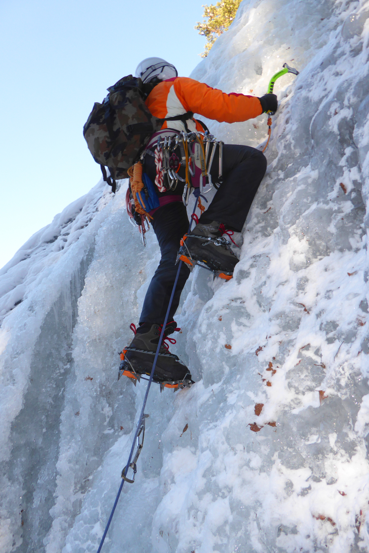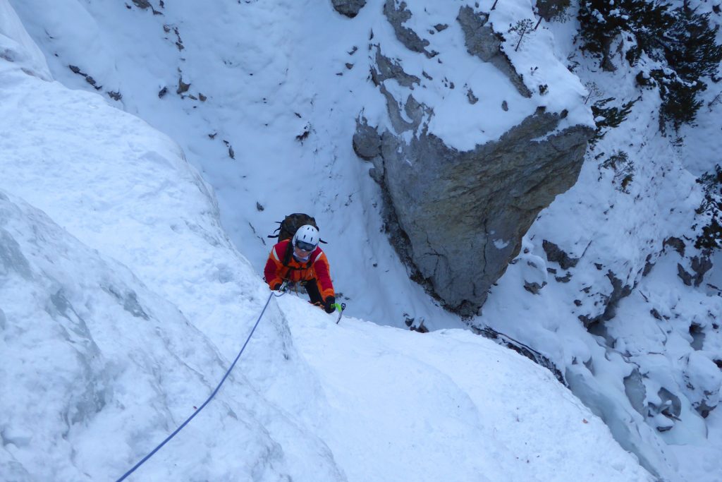 Tukaj pa se mi zgodi manjši incident. Veselo namreč plezam, pozorna na oporne točke in v najbolj strmem delu se mi dereza zatakne za vrvico od špice za čiščenje lednih vijakov. Spodnese mi najprej eno nogo, potem pa še drugo in obvisim na cepinih. Ob visenju na cepinih pa se tudi ni najbolj enostavno postaviti nazaj na noge. No pa sem spet bogatejša za eno izkušnjo. Preplezamo ga po vseh smereh vsak 3x.