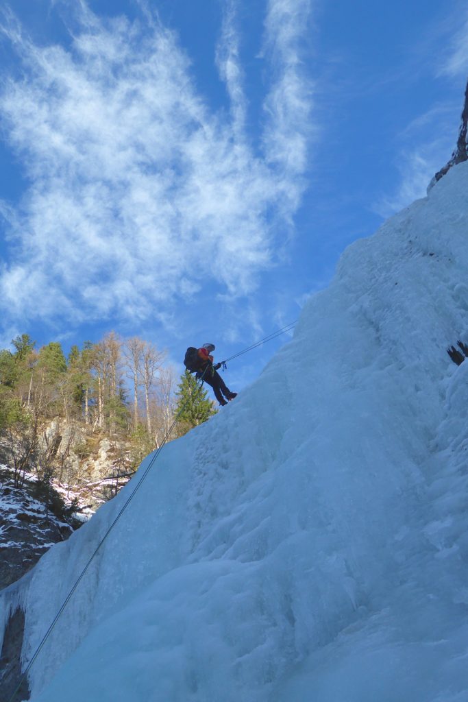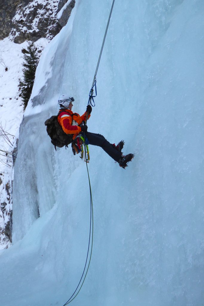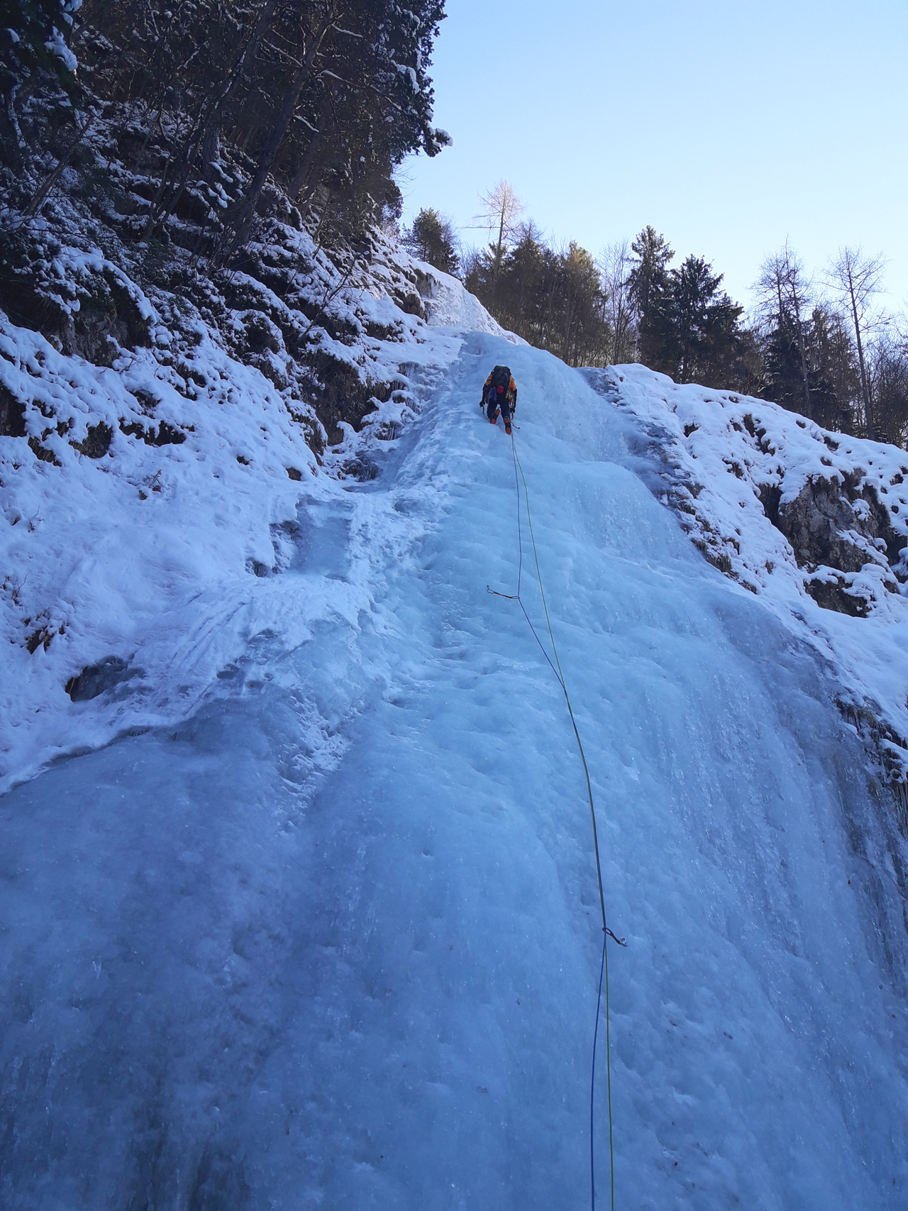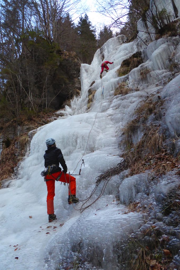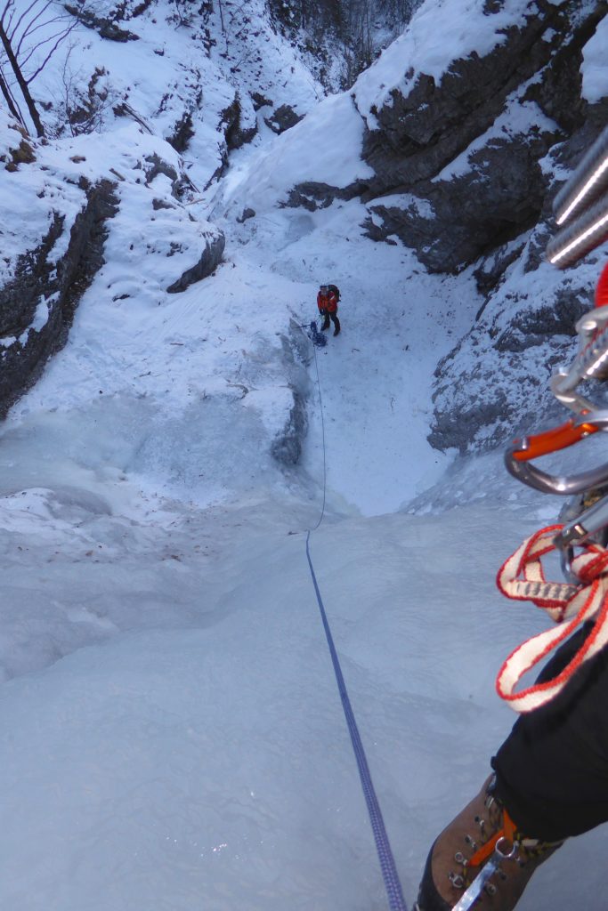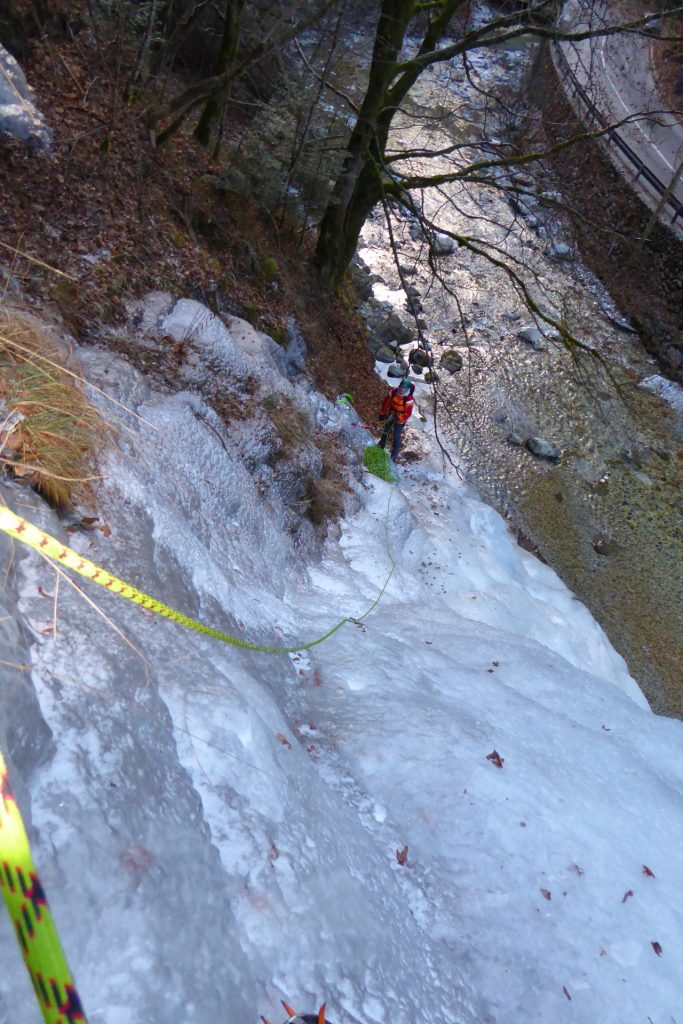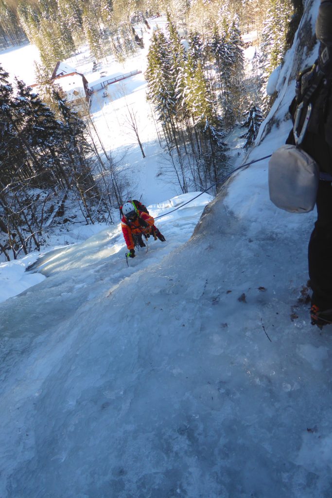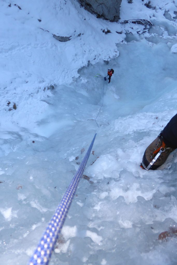 Po prihodu nazaj dol preplezamo še prvi raztežaj po levi strani. Led je tukaj mehek in moker in idealen za plezanje, če seveda odmislim mokre rokavice.