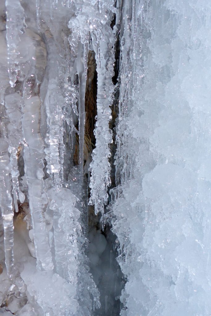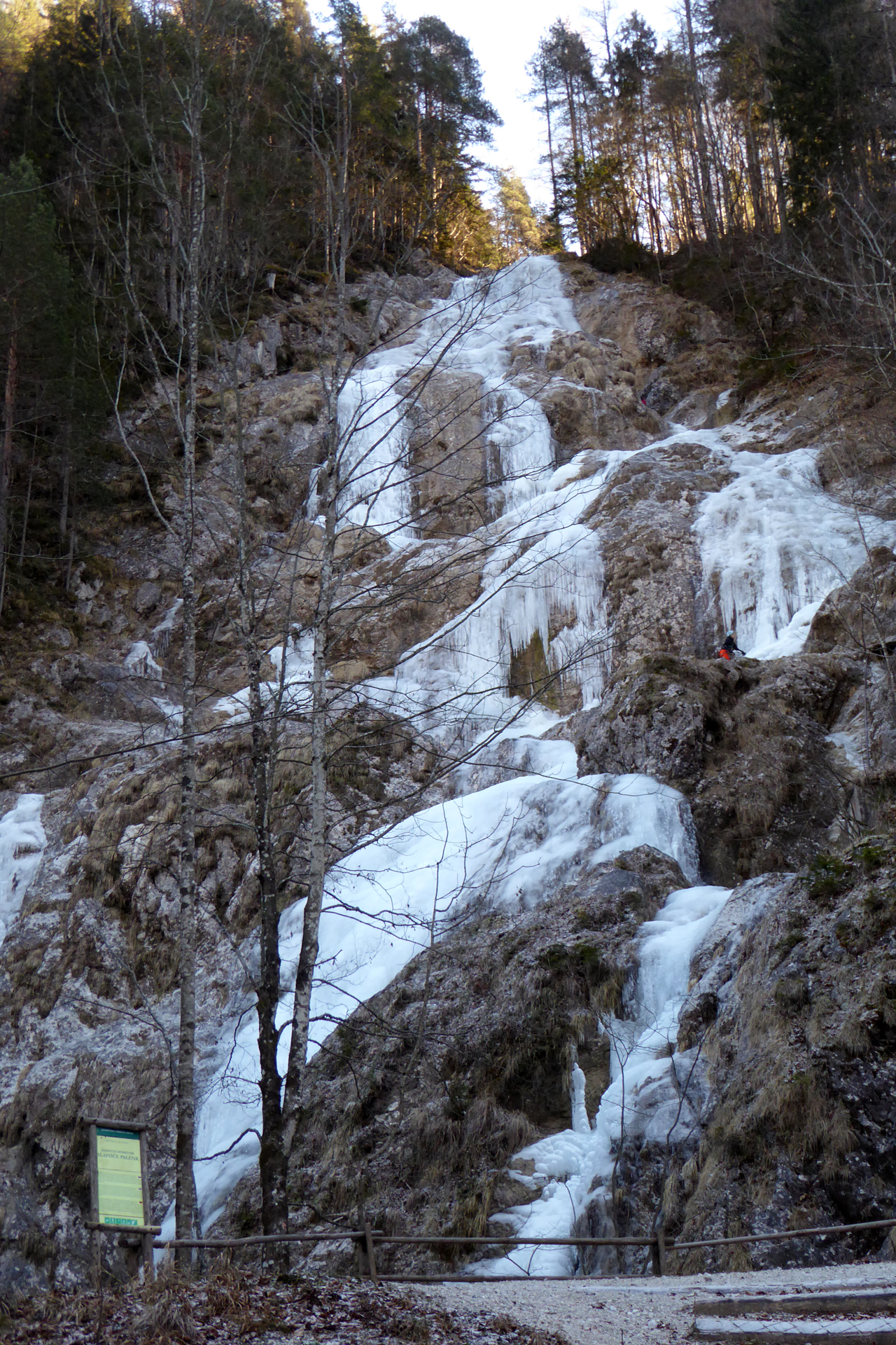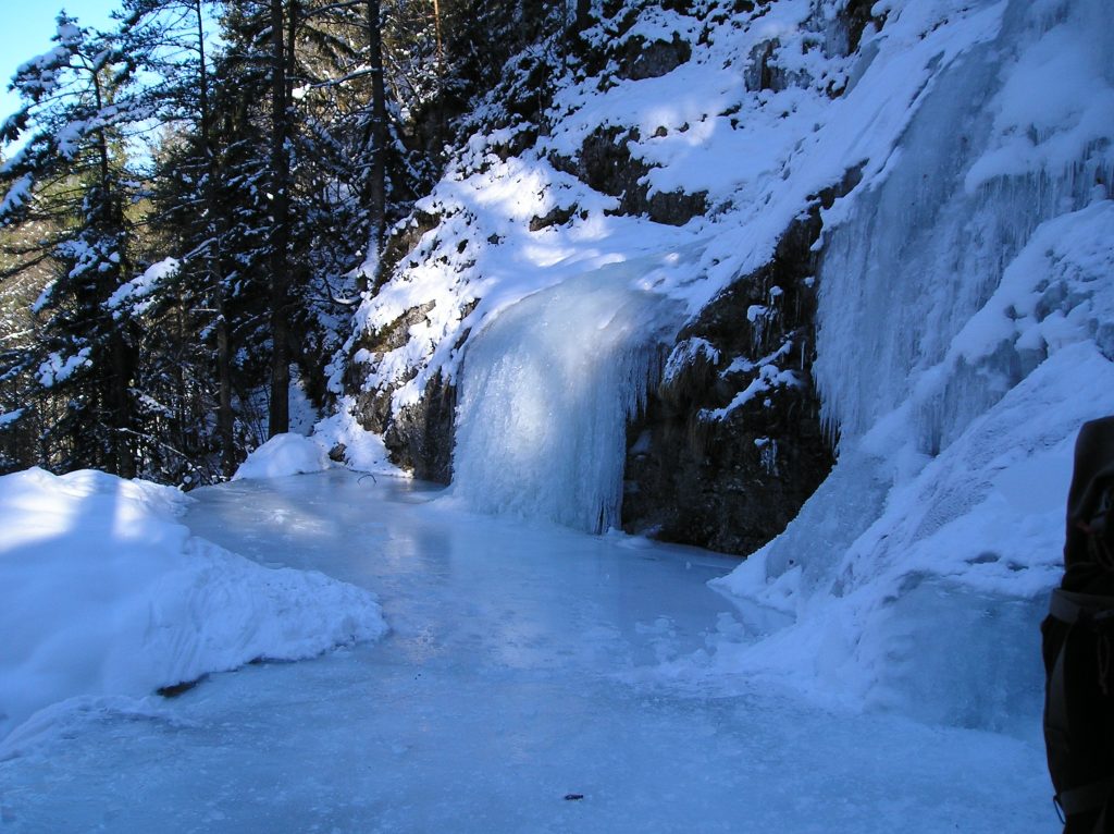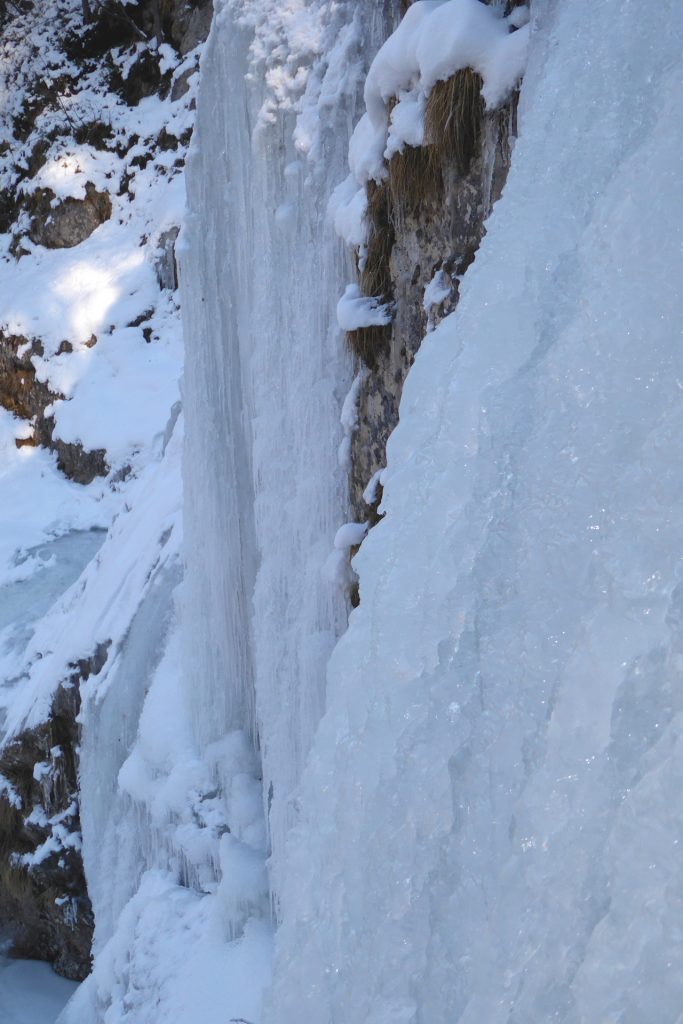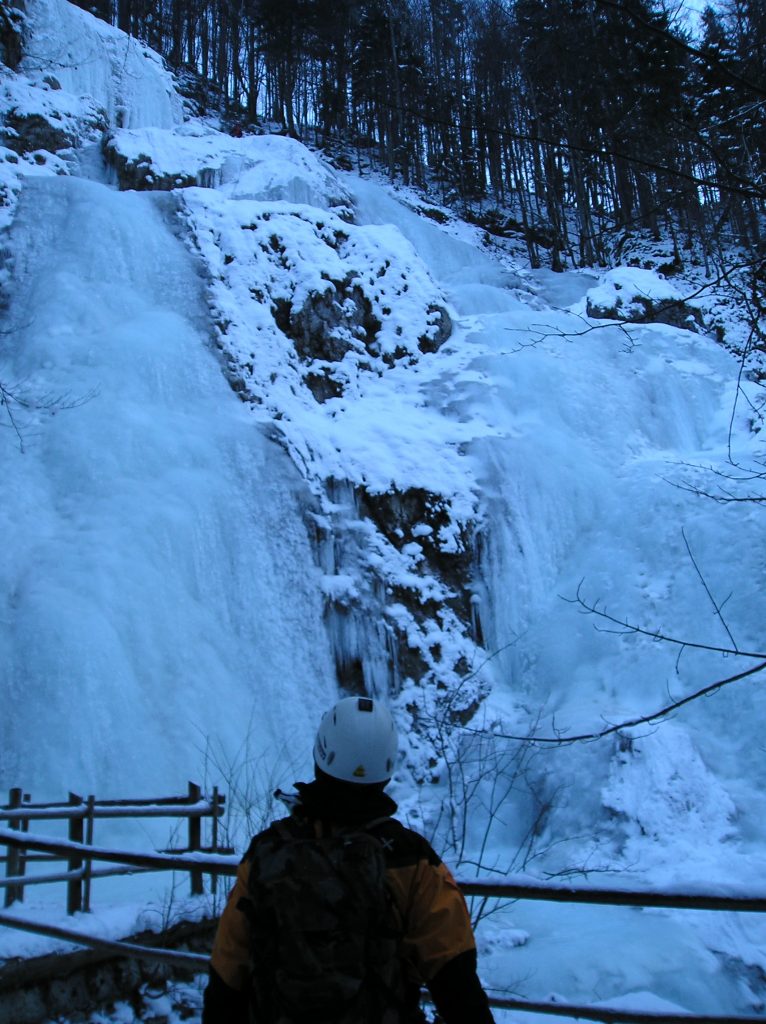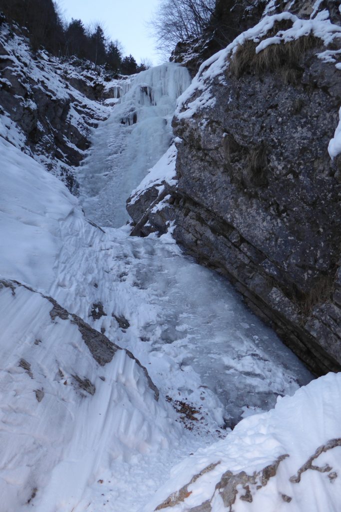 Led je trd, vendar gre brez problemov, jezi me le, da mi je fotoaparat spet zaštekal – očitno ne prenese mraza. Nadaljujeva po zaledenelem potoku in po pbl 20 minutah prispeva do še lepšega in mogočnega zgornjega slapa.