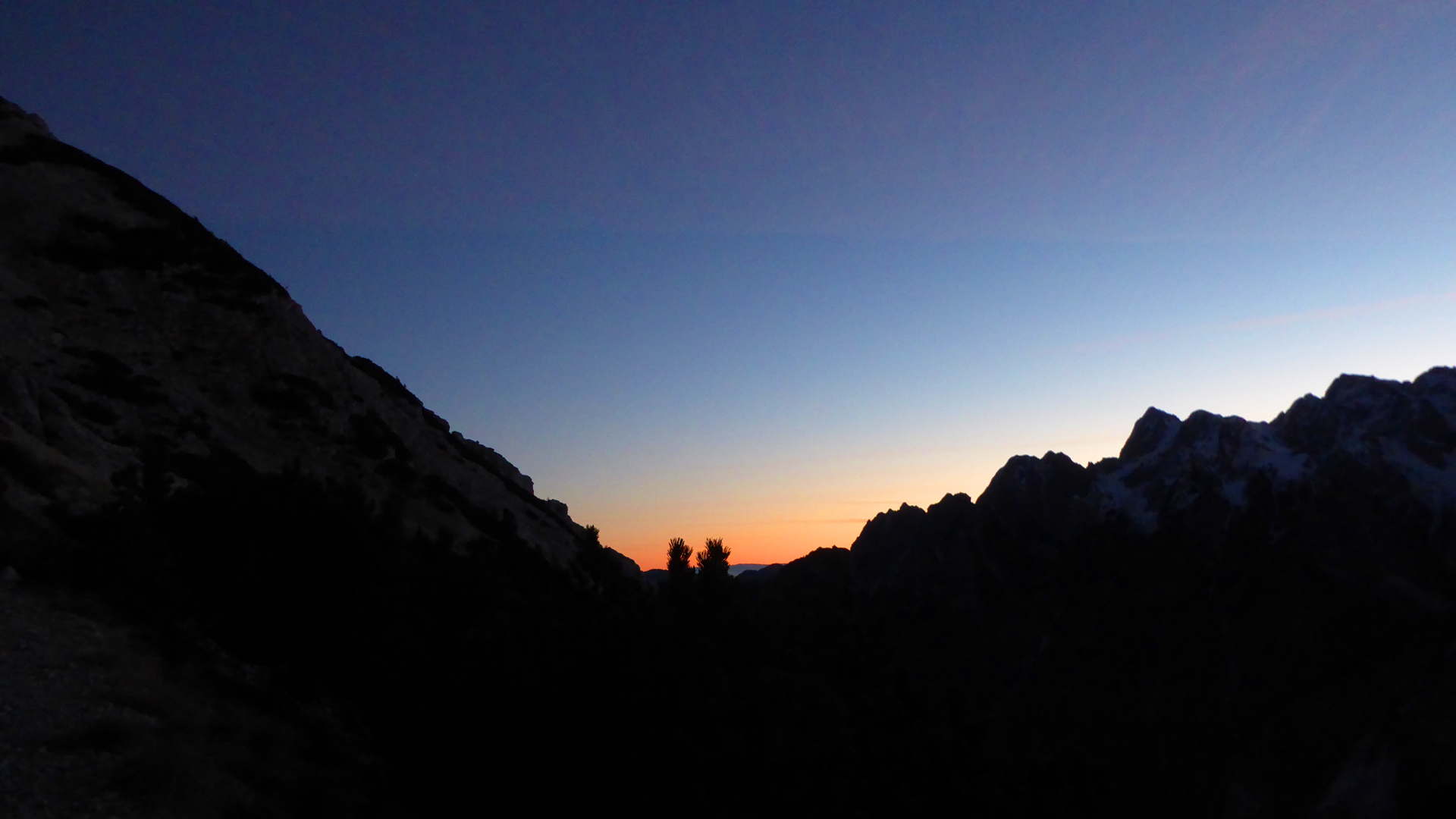 Pomalicava in še kar nekaj časa uživava v krasni panorami. Čevlji me tako tiščijo, da nog skoraj ne čutim, ne upam pa se sezuti, ker se bojim da bi bilo potem še slabše. Začneva sestopati, počasi in previdno, saj je pot popolnoma zmrznjena, tudi sonce kmalu zaide, midva pa sva šele pred najtežjim delom sestopne poti – pod sedlom nad Vršičem je sneg in potrgana zajla. Odločiva se za abzajl in ta del je še najlažji, potem pa se je začel sestop po zelo strmi stezi z zmrznjenim peskom in gladkimi skalami. Ob zdrsu bi poletel direktno na Vršič. Jaz sem pa po obrokih koristila zadnjo plat, saj sem se tako počutila najbolj varno. Že skoraj v temi sva prispela do normalne poti in varno sestopila na Vršič.