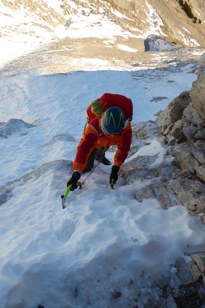 Sledi predhodnikov se tu povsem izgubijo in ob prihodu do skal nato nadaljujeva po za naju najboljšem prehodu/žlebu. Pričneva se varovati, vendar primernih skal za vmesna varovanja ni, Končno Mijo le najde nekaj in zabije 2 klina za sidrišče. Mijo me vseskozi bodri kako mi gre fajn, pa ne vem ali me le tolaži, da ne bi začela težiti ali pa misli vsaj malo resno. Čevlji me čedalje bolj utesnjujejo, tudi v roke se mi zanohta v prvem sidrišču, pri plezanju se pojavljajo rahli krči. Tudi z izbijanjem klinov imam težave, eden noče in noče ven – razbiti moram skalo, da ga dobim ven. Ko pa začnem plezati pa se hitro segrejem. V drugem sidrišču je malo bolje – klini gredo ven, le ni mi jasno kako Mijo uspe najti skalo primerno za sidrišče, ker so skoraj vse ali popolnoma gladke ali pa totalno krušljive. Tudi s sporazumevanjem imava težave, saj se kljub kričanju, ne slišiva. Na drugem sidrišču čakam in čakam in le po dolgem času veter prinese komando za »nehaj varovati« in potem »varujem«. Teren je čedalje bolj strm, le nekaj zaplat snega je med gladkimi skalami. V malo večji skali je narejeno vmesno varovanje na klinu, ki pa najbrž ne bi prenesel večje obremenitve, vrv pa gre navzdol okrog skale. Izbijem klin in grem do prečke in šele takrat z grozo vidim kako navpična je stena