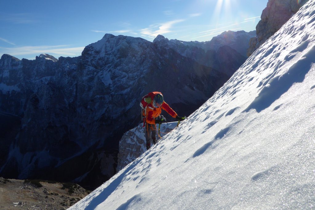 Ko prispeva do snežišča se je zdanilo in prvi sončni žarki so pozlatili vrh Male Mojstrovke. Nadeneva si dereze in ostalo alpinistično opremo, še enkrat pogledava skico in začneva plezati po snežišču navzgor. Sneg je krasen – ravno prav trd da zagrabijo dereze in cepini. Dogovoriva se, da če mi bo pretežko/prestrmo, da povem in se bova navezala. Strah me ni in po snežišču mi gre kar dobro, problem pa nastopi ko prispeva do skal, kjer je snega bolj malo.