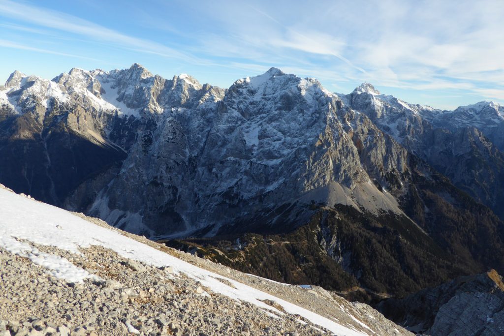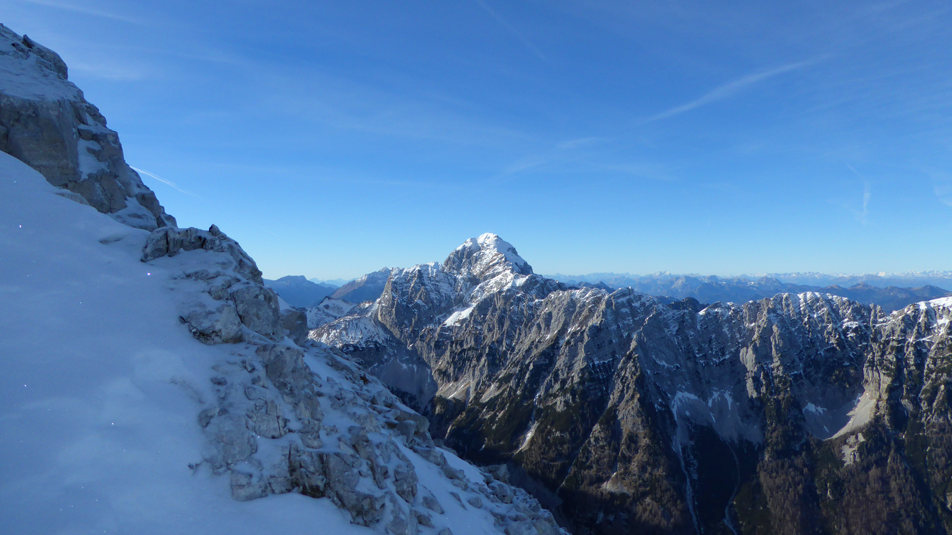 prikrempim v grapo. V njej so razmere idealne – snega je dovolj, tako da se le sprehodim do sidrišča. Kako enostavno bi bilo … Mijo gre naprej in na vrhu reče »Fak, totalno sva mimo«. Meni se že začne kolantati po glavi: kaj bova sedaj? Bogve koliko raztežajev še bo?. Ali bova lahko prišla na varno pred temo?,…. Ko Mijo uredi sidrišče, grem naprej proti vrhu, zagledam Mangart in v ozadju Jalovec, na tleh pa olupek od mandarine – nekaj ne bo štimalo – Mijo me je nahecal – sva na vrhu Male Mojstrovke. Toplo je in odprejo se kristalno čisti razgledi na Julijce, Kranjsko goro, megleno morje nad Avstrijo in Avstrijske Alpe.