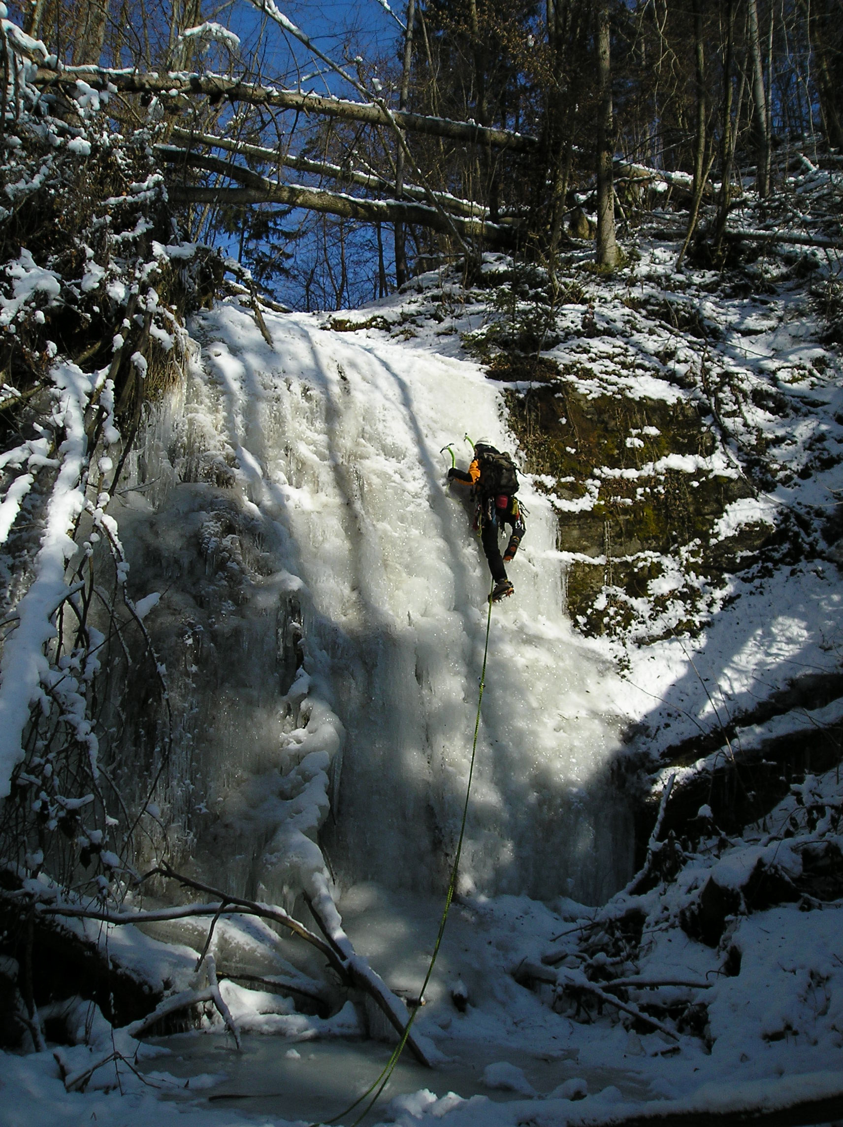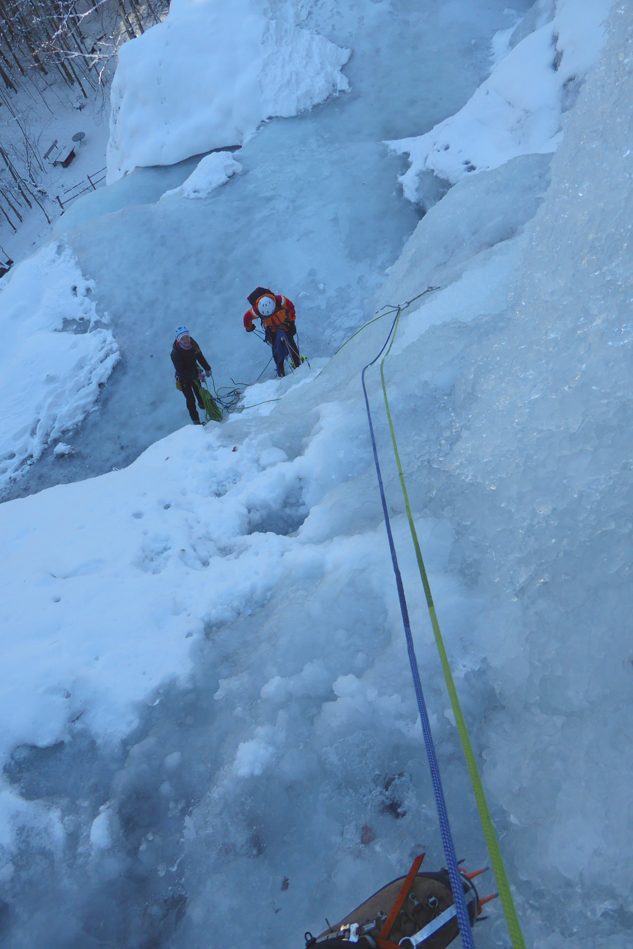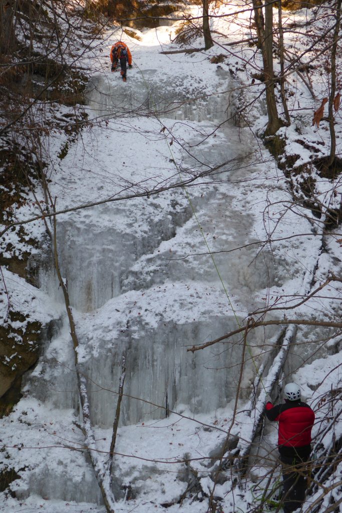 Slap je kratek in zanimiv. Tudi cepini in dereze so mi že bolj domači, pa še zebe me ne. Plezava na »top rope«. Preplezam 6x po vseh možnih straneh. To je bil odličen trening za kaj resnejšega.