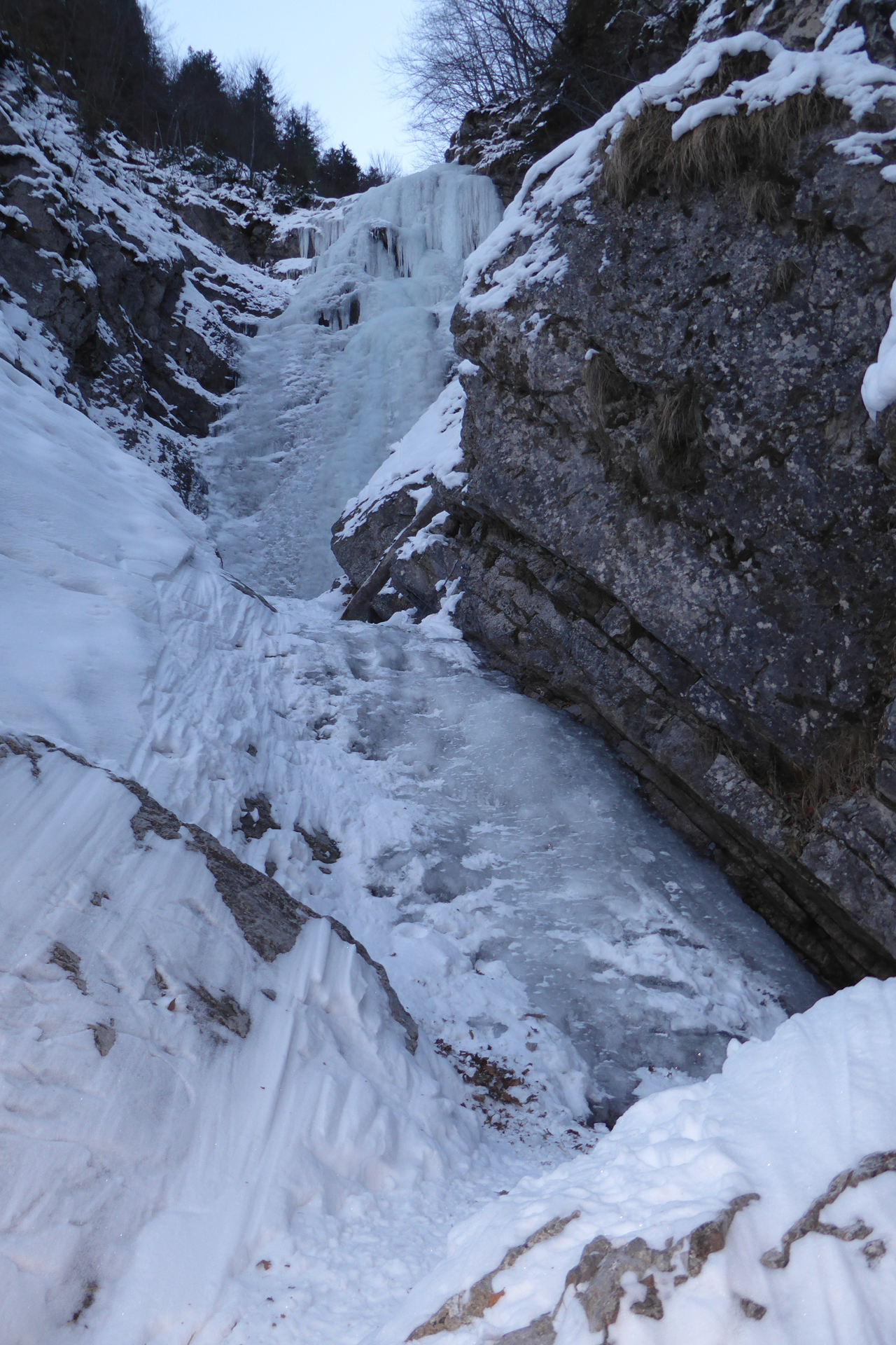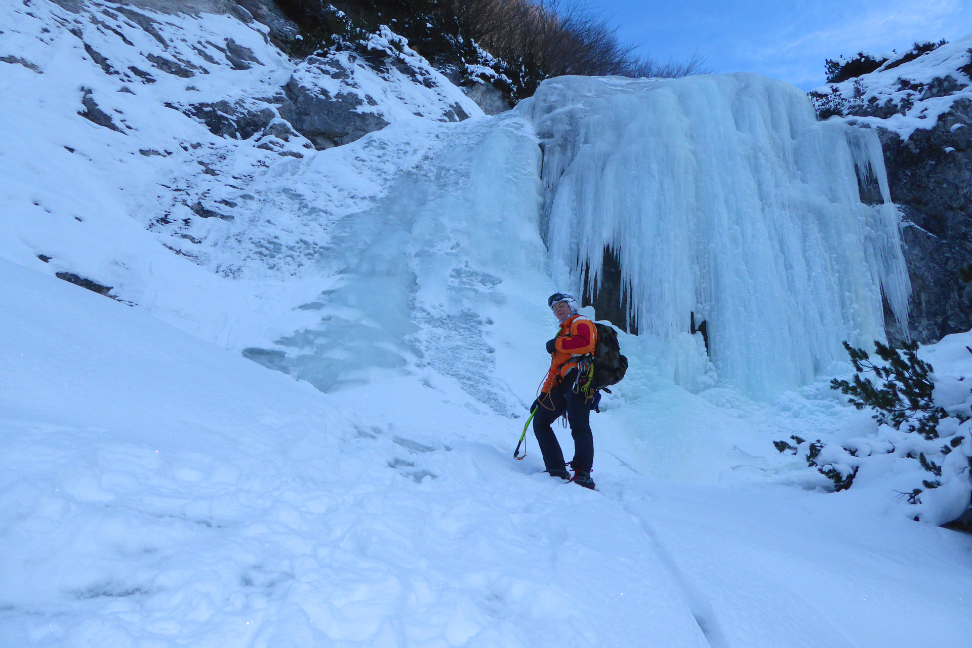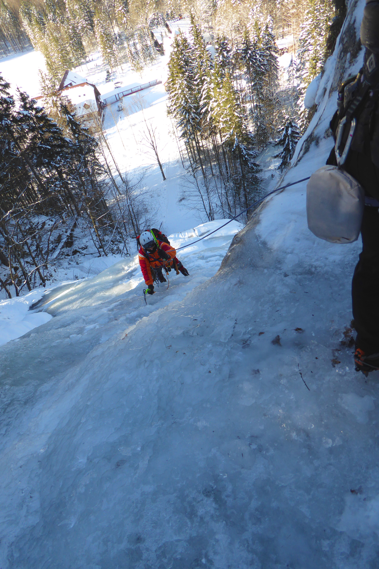 špicah derez ni najbolj prijetno hoditi, najbolj naporno pa je izvleči cepin iz ledu. Pazim na pravilo treh opornih točk in tudi ledne vijake kar uspešno odvijam in čistim. Ko pa pridem do zadnje vertikale, ki jo je bilo potrebno postrani preplezati pa me postane pošteno strah; pomislim kaj bi bilo če bi mi zdrsnilo – čeprav sem na »štriku« bi padla kar nekaj metrov niže in se pošteno potolkla; kje bi pristali cepini in dereze pa lahko samo ugibam. Globoko zajamem sapo in preplezam ta del. Zgornji del je malo bolj položen in poleg tega, da se mi zanohta v roke nimam večjih težav. Ko pa pridem do sidrišča pa tudi začuda mraz v rokah popusti. Kasneje si ogledava še Palenk in nato odideva domov. Za prvič je bilo kar dovolj.