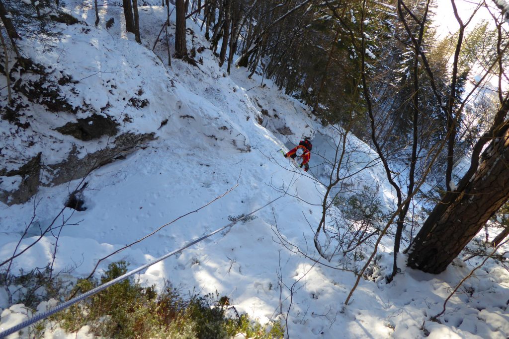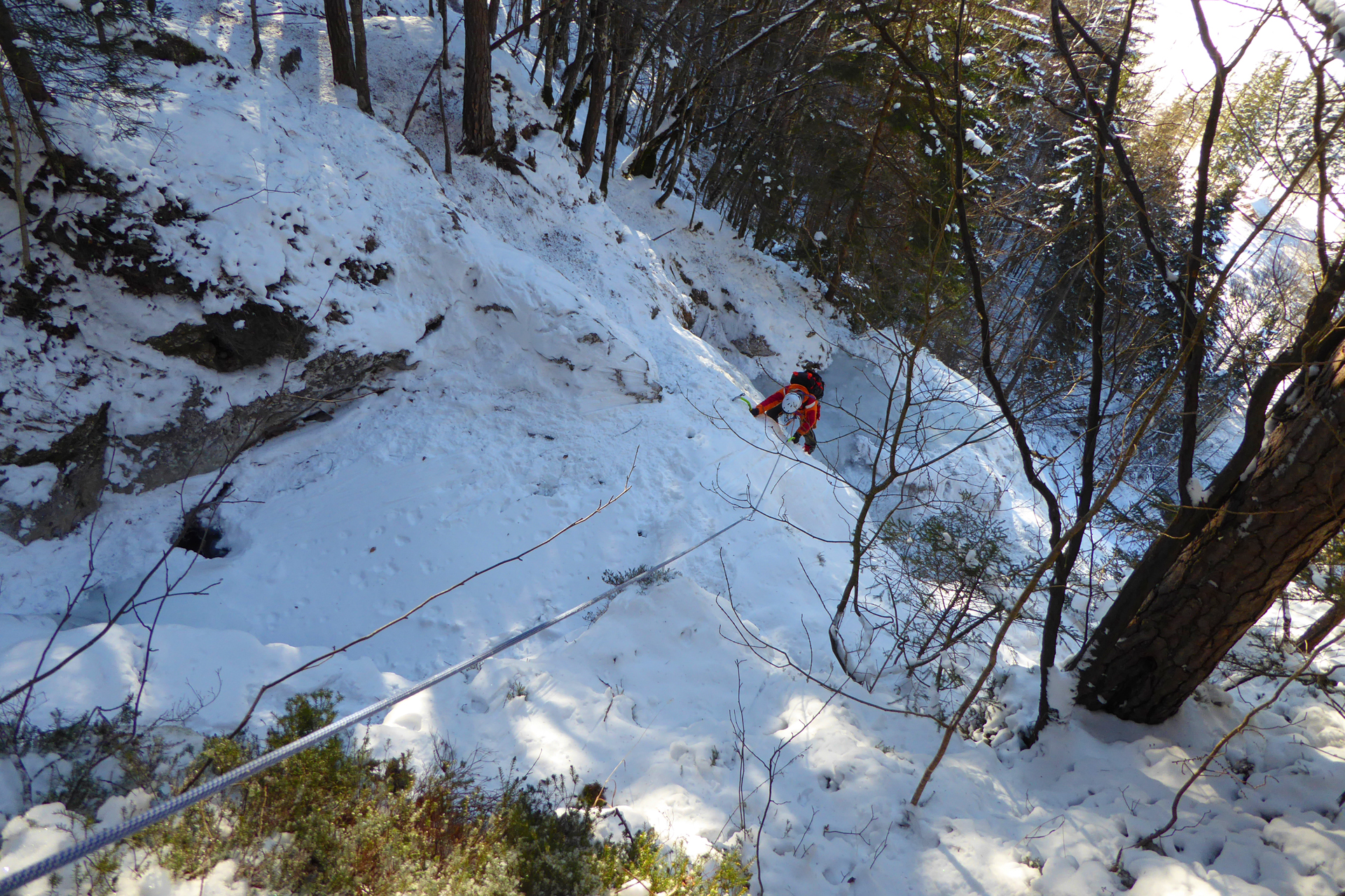 Ni me strah in v redu napredujem. Na izpostavljenih mestih zavrtam še tri ledne vijake. V zgornjem tolmunčku je danes voda, medtem ko je bil zadnjič popolnoma zalit z ledom. Sidrišče naredim na najdebelejšem boru, namestim reverso in začnem vleči. Pri tem se pošteno namučim, saj je vrv popolnoma zamrznjena. Pomislim, da bi bilo fajn ko bi lahko takrat ko te zebe preskočil na tole delo in se na hitro segrel.