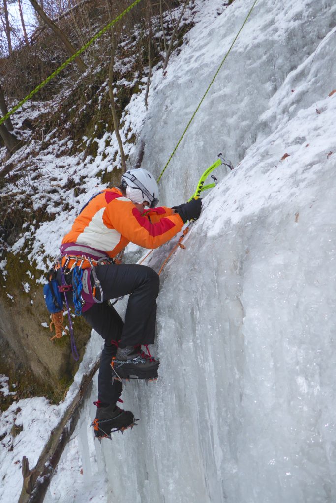 V Logarski je -11⁰C, v tolmunčku pri vstopu v slap pa je na ledu 10 cm ledene vode. Da ne bi vrvi že v začetku zmočili si uredimo sidrišče v pokončnem ledu. Mijo začne plezati desni krak, saj na levi strani vse teče. Led je zelo trd, pa kljub temu dva raztežaja preplezamo brez težav. Na tretjem sidrišču pa me Mijo vpraša, če grem plezat v vodstvu. Seveda sem takoj za. Kolikor se spomnim od zadnjič ta raztežaj ni pretirano zahteven, skrbi me le kako bom zavrtala ledne vijake. In začnem, v tem delu so v led od predhodnih plezalcev narejene stope, tako, da napredujem brez težav in tudi prvi vijak z lahkoto zavrtam.