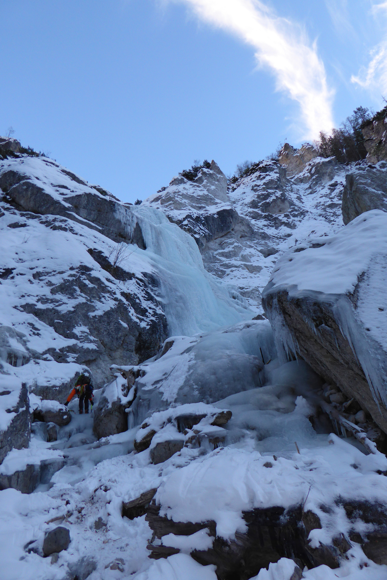 Odločiva se, da greva pogledat še naprej – in splačalo se je. Potok se razcepi v dva dela in desni del zaledenitve je v prvem delu bolj položen, v zgornjem delu pa se nadaljuje v ozek pokončen pramen. Odločiva se za levo stran, kjer naju pričaka zelo lep, malo krajši in pokončen slap.