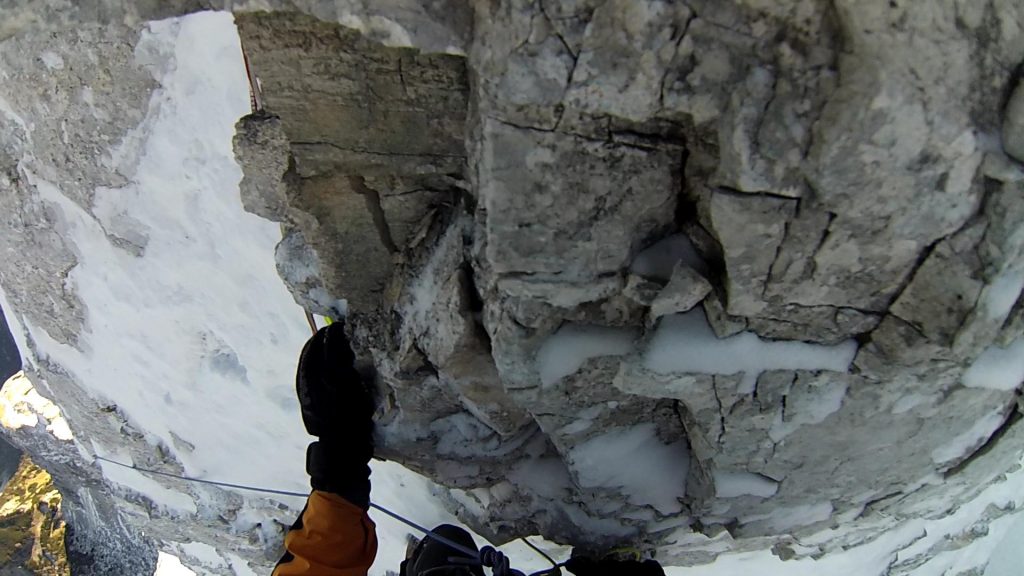 – s centimetrskimi in krušljivimi oprimki, praktično brez snega – če bi mi zdrsnilo bi na dolgo zanihala in pošmirglala celotno prečko. Vmesni zatič je kar poletel iz male poke ko sem prišla blizu. Parkrat globoko vdihnem in začnem. Namerno zrušim še precejšen del skale in začnem plezati, nekje na sredini prečke celo uspem vrv spraviti navzgor, da je varovanje vsaj koristno. Mijo me bodri in usmerja, napredujem počasi in le končno nekako