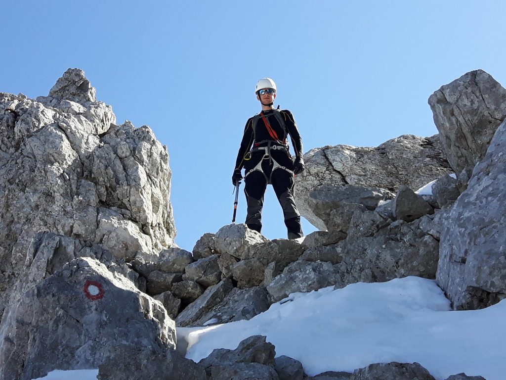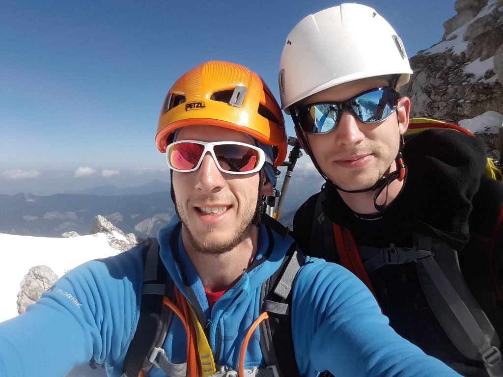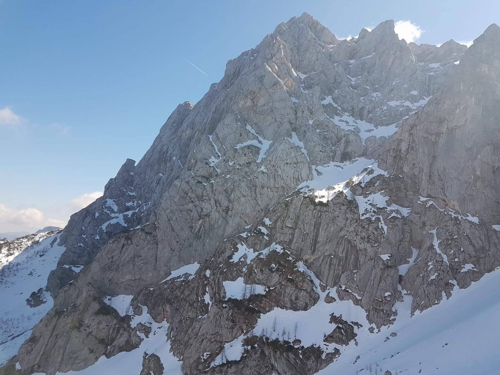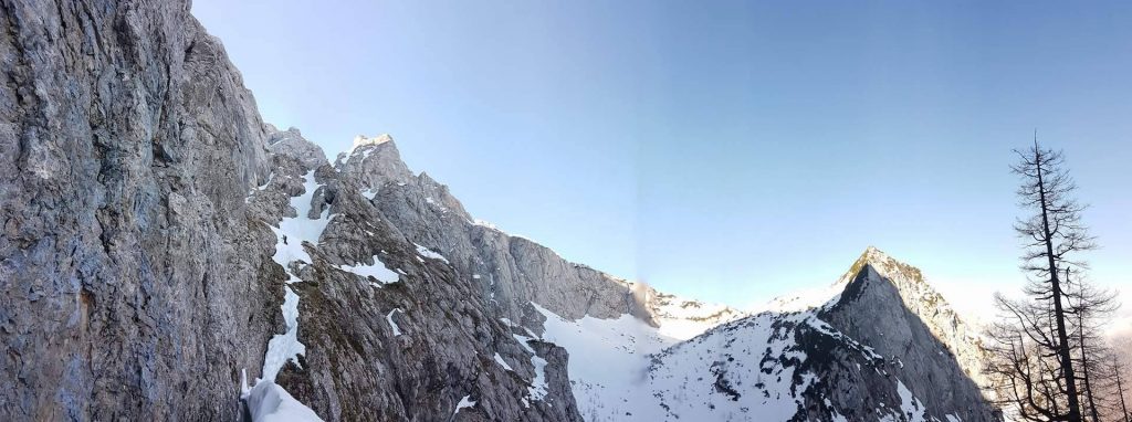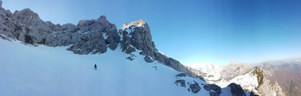 Nadaljujeva skupaj, saj je sneg kompakten in je pravi užitek. Za ovinku naju pričaka še en skok, spet razpleteva vrv in se naveževa. Tudi ta skok nama ponudi lepo praskanje po skalah z derezami, vendar ne predstavi takšnega problema kot skok nižje. Ko zlezeva iz roba skale se nama odpre pogled proti najini prečki ter amfitatru. V prečki nadaljujeva navezana, saj je bila že na pol kopna. Proti amfitetru naletiva na razmere, ki sva jih pričakovala. Preostala pot do vrha pa nama je predstavljala popoln užitek.
