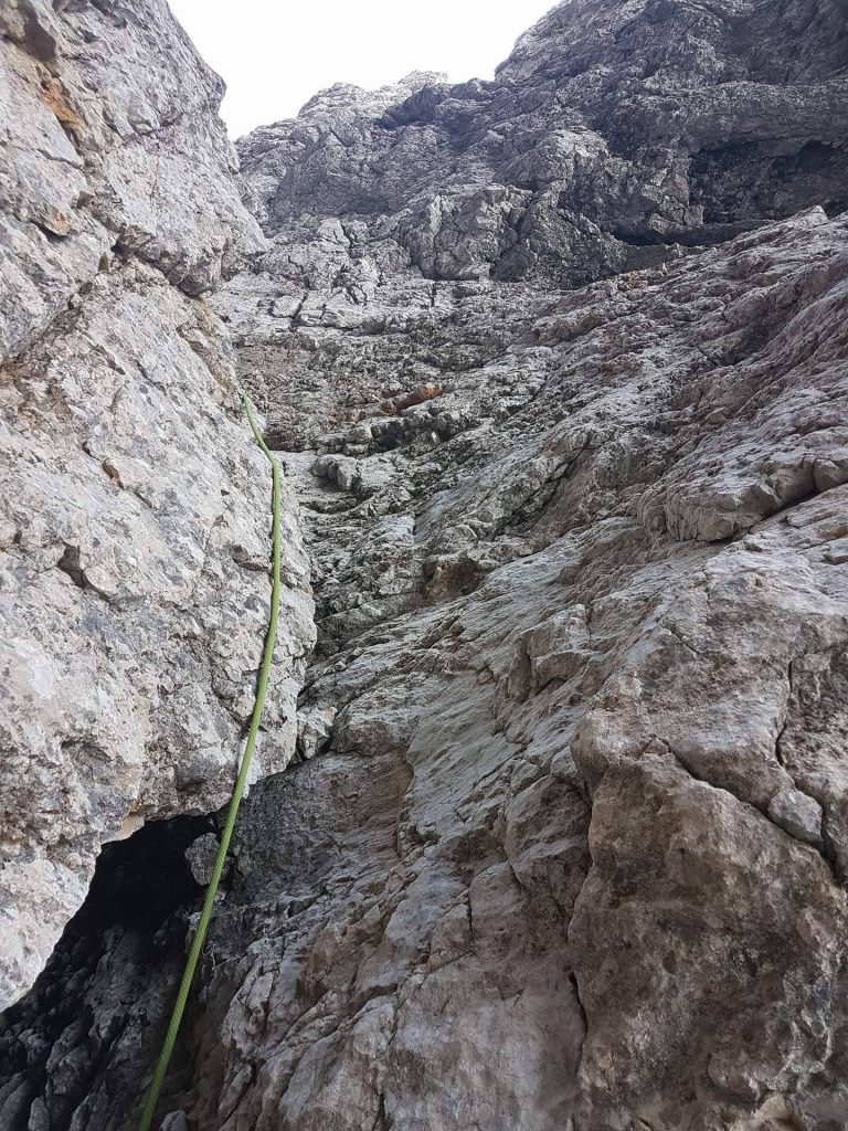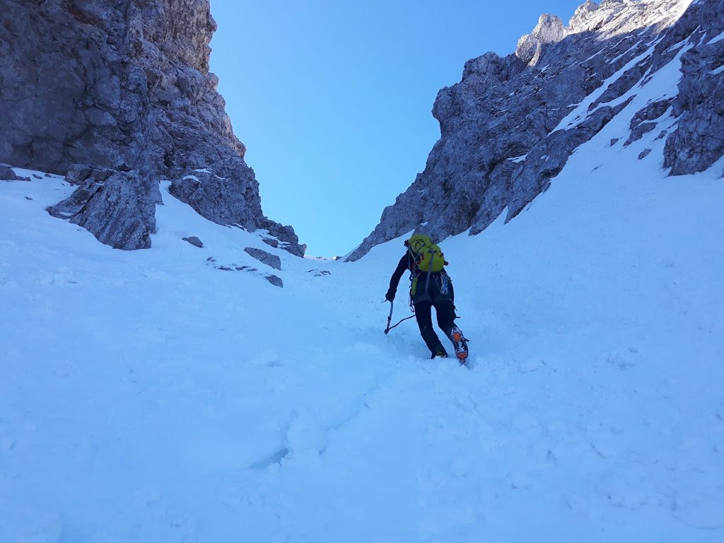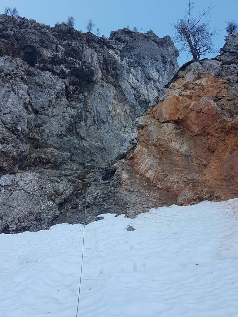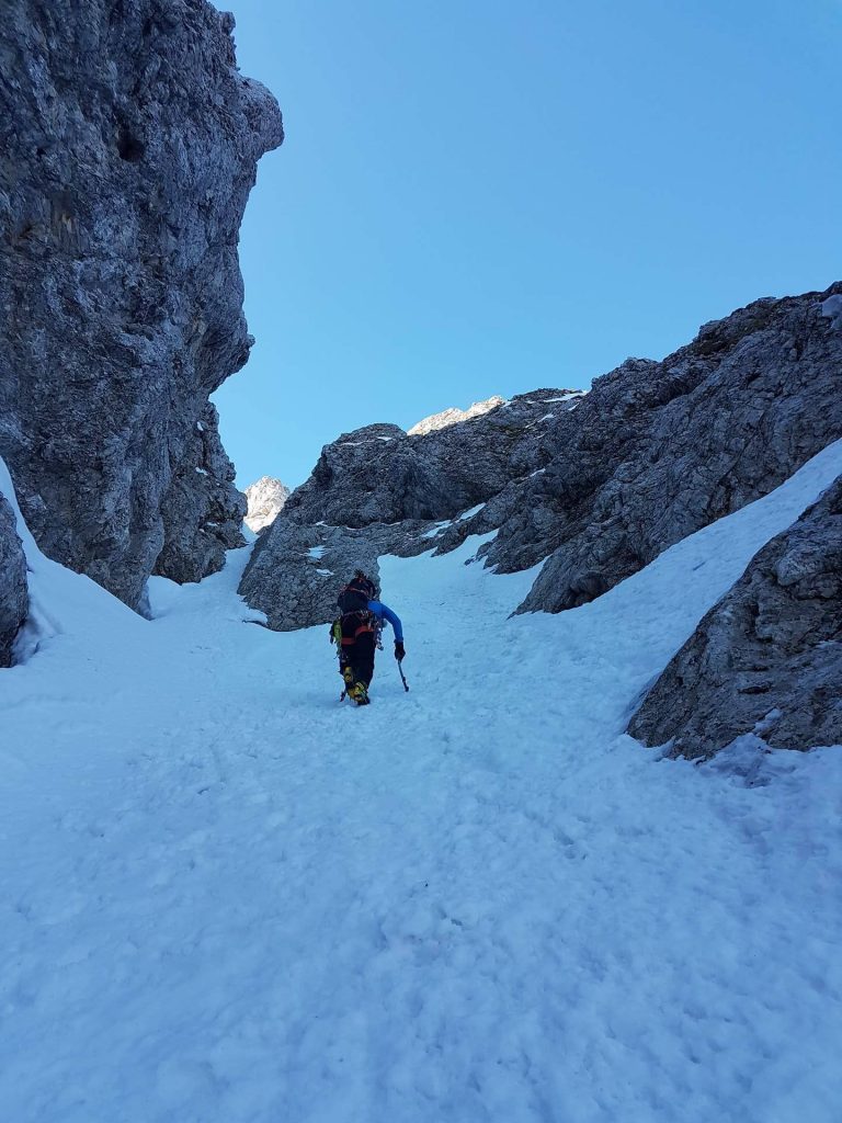 Bolj kot se dvigujeva večja je inverzija toplejše temperature. Pri Klemenči jami še vedno ni znaka o snegu. Nadaljujeva svojo pot ter upava na najbolje, saj nama celo smer zakrivajo oblaki, kot samo Ojstrico. Na razpotju za Škarje ter Kopinškovo pot začneva gazit v sneg, ki je bil že precej južen. Vendar sva prepričanja da bo višje bolje. Iz koraka v korak se razmere začnejo izboljševati in že sva pri vstopu v najino grapo. Prvi del grape je že kopen, kar sva nekako pričakovala. Počasi se nama oblaki odmaknejo in zagledava prvi del najine grape. Hitro se pripraviva, razdeliva opremo in se poženeva v pri raztežaj. Sam skok ni bil tako zahteven, kot je bil naložen ter moker. Počasi ga preplezam in vstopim v grapo, ki je ponudila še za odtenek boljše razmere kot so bile nižje.