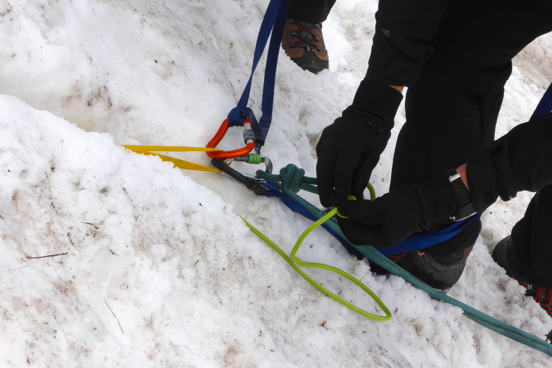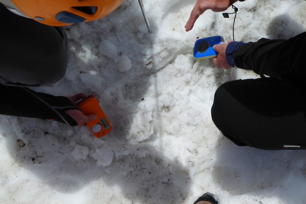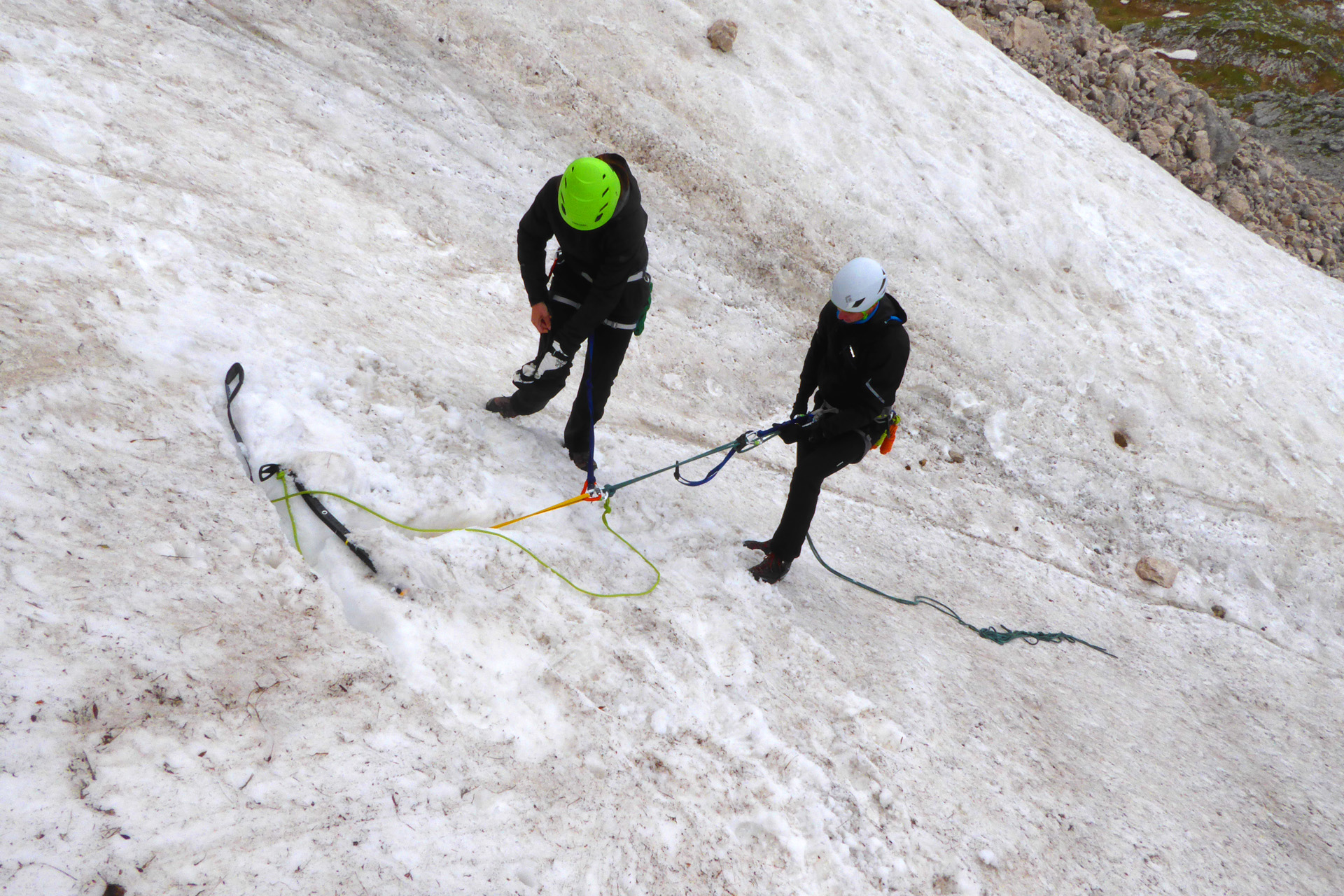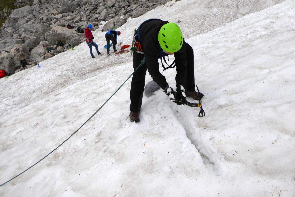 Učili smo se hoje z derezami in cepini, izdelave sidrišč v snegu, ki so bila zares zihr zaradi mokrega in zbitega snega. Vadili smo gibanje naveze in varovanje, spust po vrvi v snegu in zaustavljanje v primeru zdrsa. Pri spoznavanju plazovnega trojčka smo naredili vsak svoj prerez snežne odeje in potekmovali v iskanju “zasutega”. Ob tem ni manjkalo Mijotovih nasvetov in poučnih primerov.