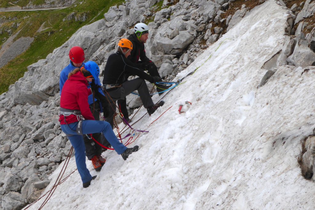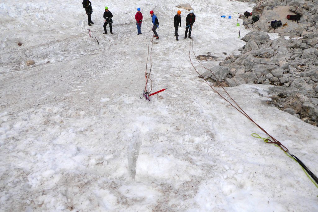 Preteklo soboto smo se v sklopu alpinistične šole navsezgodaj zjutraj odpeljali proti Mangartskem sedlu, v iskanju ostankov snega za učenje zimske tehnike. Nedaleč od izhodišča je Mijo našel kvadraturo in naklon, primerno za snežni peskovnik 6 tečajnikom.