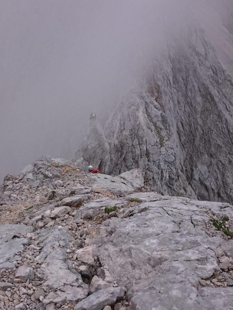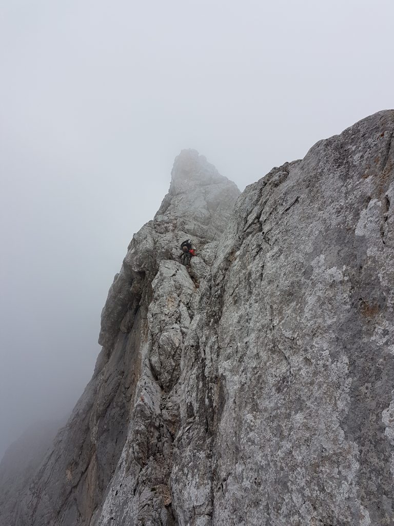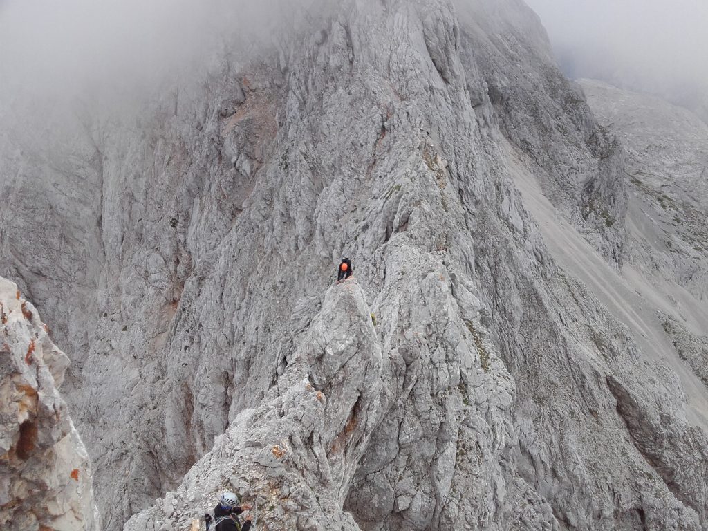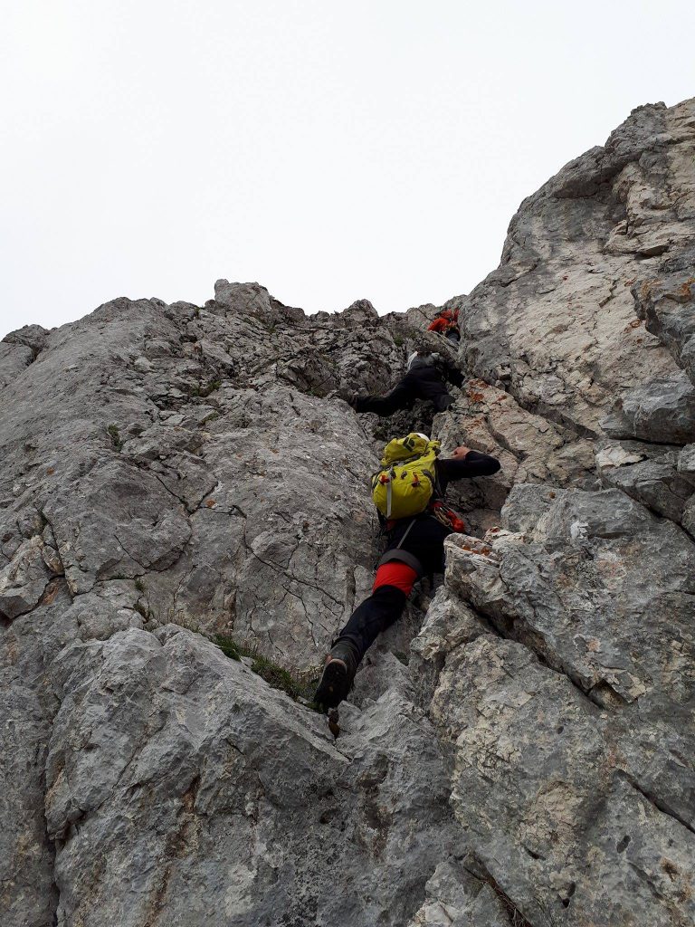 Začeli smo po desni (severni) strani grebena, kjer je od začetka še kar šlo, prehodi so bili dokaj dobri na kar se je kmalu vse spremenilo stena je postajala čedalje bolj izpostavljena, nekih logičnih lažjih prehodov je bilo čedalje manj skala pa izjemno krušljiva. Tu smo po vsej verjetnosti nekoliko zgrešili pravo smer, ki skoraj sigurno že prej zavije proti vrhu oz. na levo stran grebena. Malo pred slovitim Konjem pa smo le našli prehod na levo (južno) stran grebena. Do Konja je sledil le še kratek kamin, ki ga je bilo treba preplezati, sama težavnost ni prehuda a zaradi boljšega občutka sva se jaz in Grega navezala na štrik. Konja je prvi »zajahal« Bisti, ki je tudi napeljal fiksno vrv po kateri so nato preostali »prusikarili« jaz pa sem kot zadnji plezal na »top rope«. Skala je tukaj gladka praktično brez grifov a za spremembo kompaktna. Od Konja naprej težavnost popusti zato smo nadaljevali brez štrika po grebenu proti vrhu Skute. Tu praktično nimaš več kaj zgrešiti prehodi so logični izpostavljenost pa tudi ni več tako huda. Na vrhu Skute nardimo še eno skupinsko fotko in sestopimo proti Okrešlju.