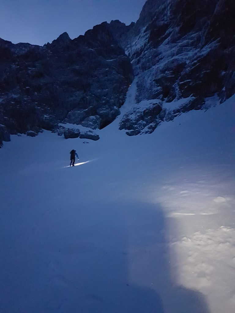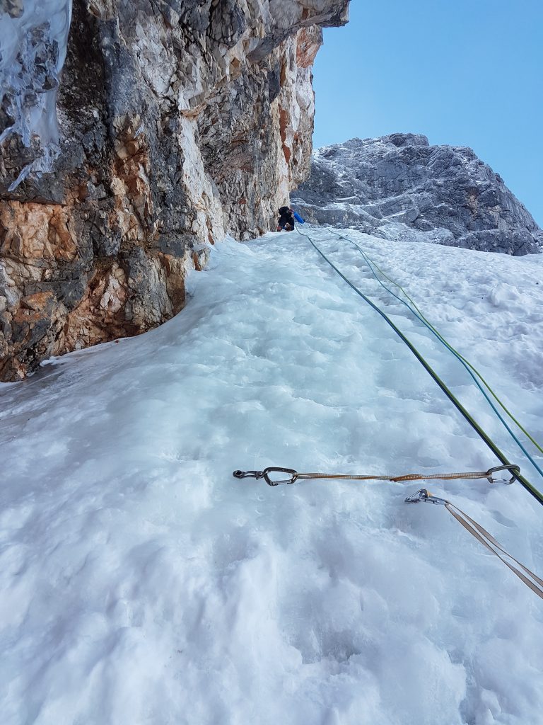 II – Cesta čez Pavličevo sedlo je zaprta, primorana sva okoli riti v žep. Vseeno odvrževa sidro že ob peti uri na parkirišču v Ravenski Kočni. Ko te z vseh strani zadevajo novice o prvovrstnih razmerah, ni težko žrtvovati dodatne ure spanja. Nisva edina teh misli, ideja biti prvi v smeri je hitro odpravljena, lučke na parkirišču, lučke višje na poti proti Teranovi smeri. Dobro, vsaj dostopa ne bova iskala v temi. Napak, vseeno prehitro zavijeva navzgor, ter dodava nekaj višincev v sosednjem snežnem jeziku. Dan se prebuja, premetavava opremo, naveze pred nama, naveze za nama, dolgčas zagotovo ne bo. Kaj kmalu lahko empirično potrdiva, fama o razmerah drži vodo, tako v prispodobi kot dejansko. Vse je lepo zalito, v bistvu se celotno smer precej lagodno popika. Kakšen plezalni purist bi mogoče celo znal povihati nosek nad predobrimi razmerami, a to nisva midva. Kakorkoli, uživava v smeri, napeljeva seveda tudi kakšnega našega (beri Štajerca). Ne vem, kako je sicer z izstopno prečko, sem prvič tod, a tokrat zgleda precej dobro, prav tako je z varovanjem. Izstopiva, a še ne sestopiva. Tihi načrt, pristopiti vse do vrha Dolgega hrbta je odpadel, ko je zbolel predvideni tretji mušketir, mojster za logistiko sestopov proti Češki koči. Fokus tako obrneva proti vzhodu. Ureževa prečko proti grapam v želji po kakšni konkretni najdbi. Pogled nama ukrade grapa v Skuti, takole na uč je videti, da bi šlo vse do vrha. Kot dve stari mami na tržnici razpredava, ali ja ali ne; gor se že skobacava, malo manj nama diši zajeten zalogaj rintanja vse od Malih podov, preko Turskega žleba in Mrzlega dola nazaj na jezersko stran. Ej, dan, kaj si tako kratek januarja? Pustiva stati do naslednjič in izbereva tolažilno nagrado, Ledinski vrh. Pod nogami prijetno hrusta, izriševa neko samosvojo direktno linijo ter zajameva skalp slehernemu skoku, ki se nama zoperstavi na poti. Na vrhu sva prvič deležna sonca, šajba za kratke rokave. Detajlno prečeševa stensko obličje. Grapa na Skuto res daje dobrodošel videz, vse ostalo ponuja izdatno mero orodjarjenja. Sledi poslednji akt, sestop mimo Kranjske koče preko Žrela, kjer se še enkrat spogledava z današnjo lepotico, nato prešerno v dolino.