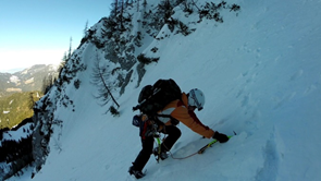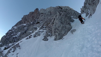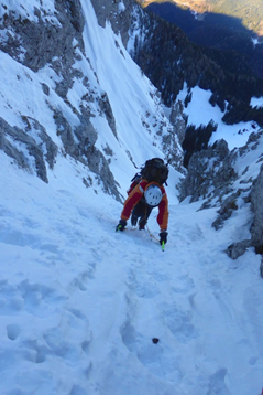 začetku dovolj, le ponekod je puhast. Na manjšem skalnem prehodu me malo stisne, saj je snega le za vzorec … in, hvala bogu, cepin vredu zagrabi. Naprej gre OK, le sape je kronično premalo, pa še na wc me tako tišči. V grapi opaziva tudi ostanke odtrganega plazu. Bolj ko se približujeva vrhu, manj snega je, tik pod vrhom pa je skoraj popolnoma golo – in za mene bo ta simpatična grapa ostala »Gola Miška«.