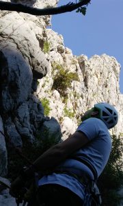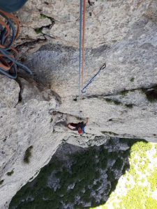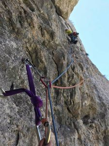 V nedeljo smo večinoma malo upočasnili sobotni tempo in se odpravili v zadnje smeri tega vikenda. Tečajniki smo zdaj z že več samozavesti lahko kalili svoje, v glavnem novopečene, vodstvene sposobnosti v skali. Po eni ali pa dveh preplezanih smereh smo prikapljali nazaj