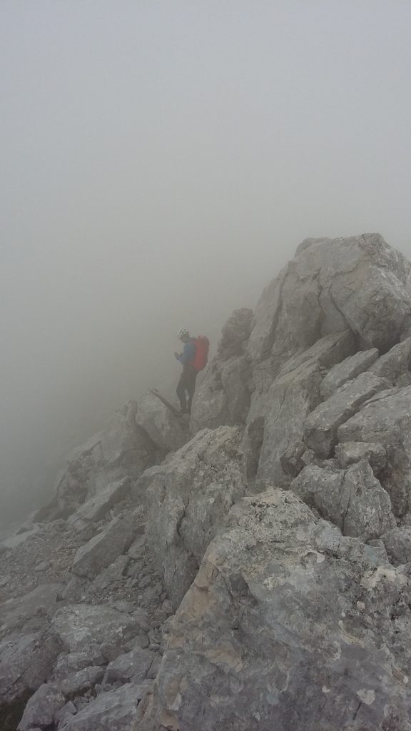 Na vrh sva prišla pozno, nekaj minut čez šesto popoldan. Vedela sva da naju čaka dolg in naporen sestop zato nisva tratila časa, hitro pospravila opremo, pojedla kar nama je ostalo in jo mahnila v dolino. Tu pa se je malce zapletlo, ker se je megla spet začela zbirat okoli vrhov, nisva našla izpostavljenega sestopa v Tamar in raje ubrala brezpotje po južni strani Šit, ki vodi v Trento.