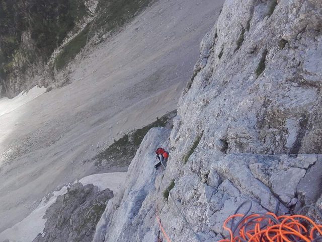 Ko sva prišla do malce lažjega sveta, sva obula čevlje in mislila, da bova v tem delu pridobila na času vendar je do kamina, ki je detajl smeri sledilo kakšnih pet ali šest polnih raztežajev naložene dvojke, kamenje pa je ves čas brneče letelo mimo ušes. Pod kaminom sva malce počila in iz sebe stisnila še nekaj skrite moči, ga premagala in z zagonom, ki ga je dalo vedenje da se bližava vrhu, preletela še zadnje raztežaje.