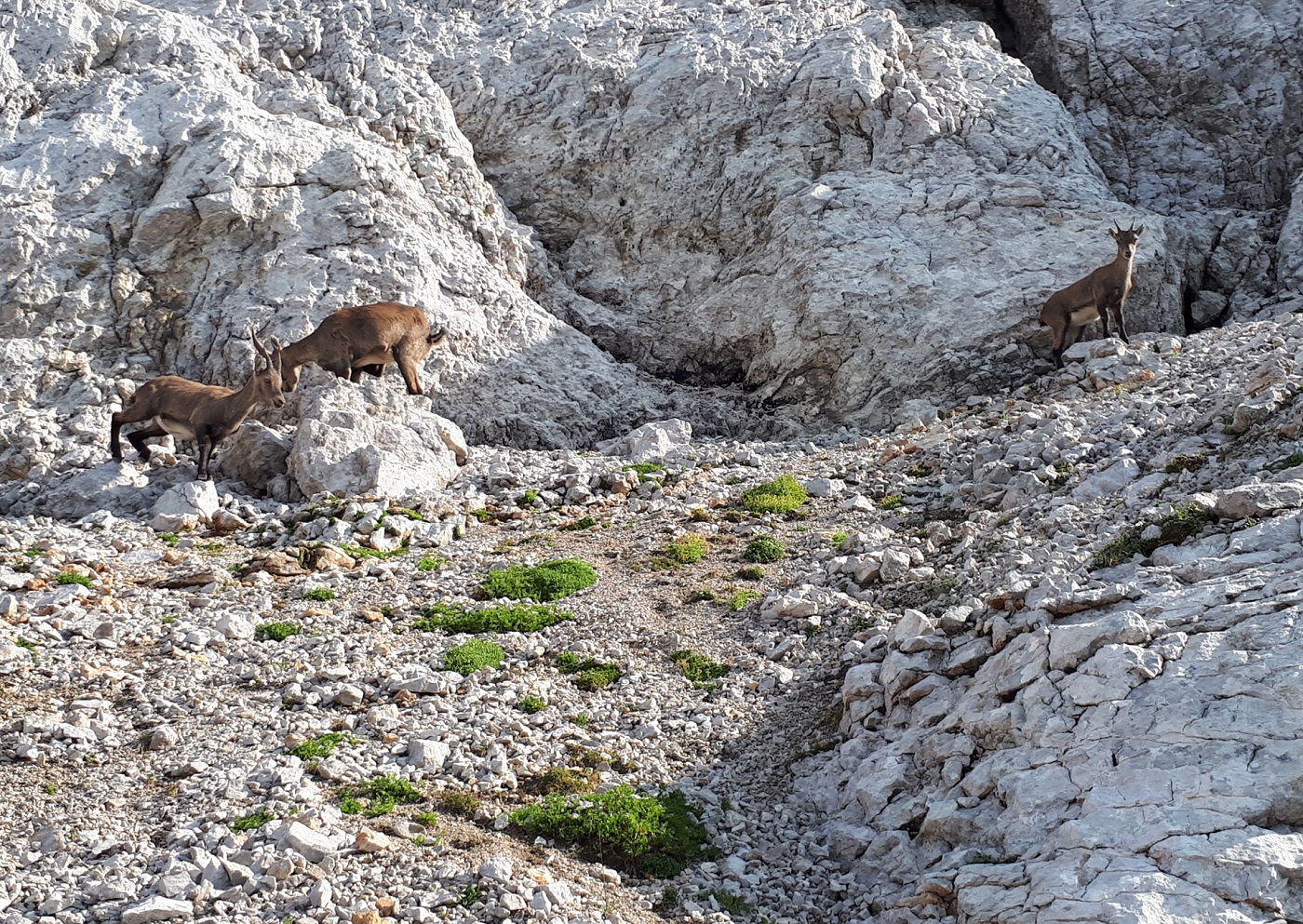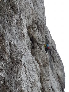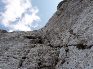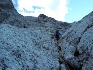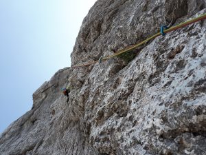 V najtežjem raztežaju, ki je dolg cca 30m sem po subjektivni oceni reševala tri probleme. Prvi se mi je zdel že vstop v gladek steber, ki ga napadeš z desne proti levi, nato prideš do zajede, ki je dobro naklinana, a malo previsna. Tukaj sem iskala rešitev, a se prvič teoretična enačba v praksi ni izšla. Gib, ki sem ga želela izvesti ni kazal napredovanja, zato sem si še enkrat pogledala stopke, zamenjala nogi, Juretu zavpila naj pazi in gib je uspel. Srčni tu-dum, tu-dum se še ni ustavil, saj težav še ni bilo konec. Sedaj je bilo potrebno splezati malo v levo in više. S pomočjo luske, ki sem jo sprva komaj dosegla, akrobatskega raztegovanja in končno dobrega roba na levi je plezanje potekalo (se mi zdi) centimeter za centimetrom, tudi misel, da se lahko primem za klin se je pripeljala mimo, a vztrajanje v težavi je dalo končni rezultat – splezano prosto. Težav še seveda ni bilo konec, cel raztežaj je bilo potrebno pošteno gristi, a vsaj nekih mejnih detajlov nisem več zaznala. Nato še dva lepa raztežaja do vrha smeri.