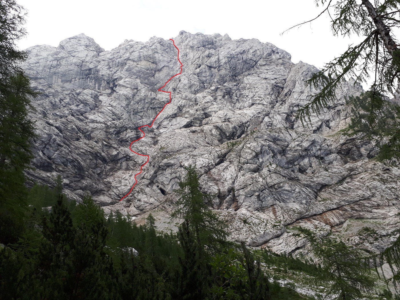 Smer ima odlično skalo v tem zgornjem delu, takšno bi si želel v vseh slovenskih hribih. Spodnji del smeri pa je zelo podrt, kot bi z mozaika kockic sestavil steno. Kdo to sploh pleza 🙂 🙂