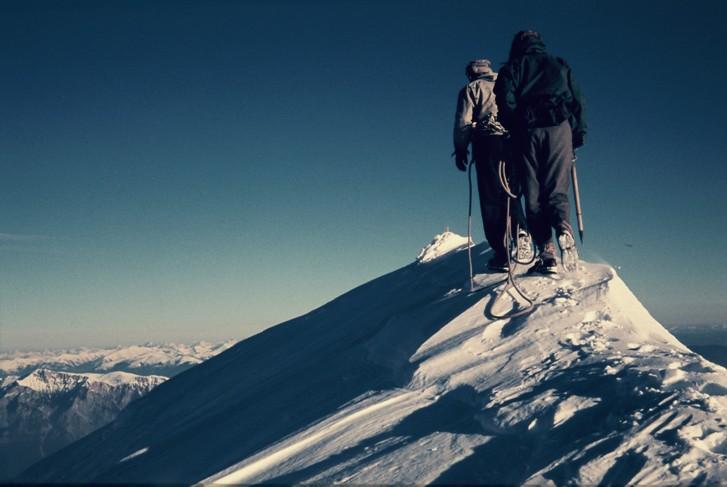 Ante Mahkota in Aleš Kunaver na grebenu med prvim zimskim prečenjem Kamniško-Savinjskih Alp od Kočne do Ojstrice leta 1959. (Arhiv: ZSA)