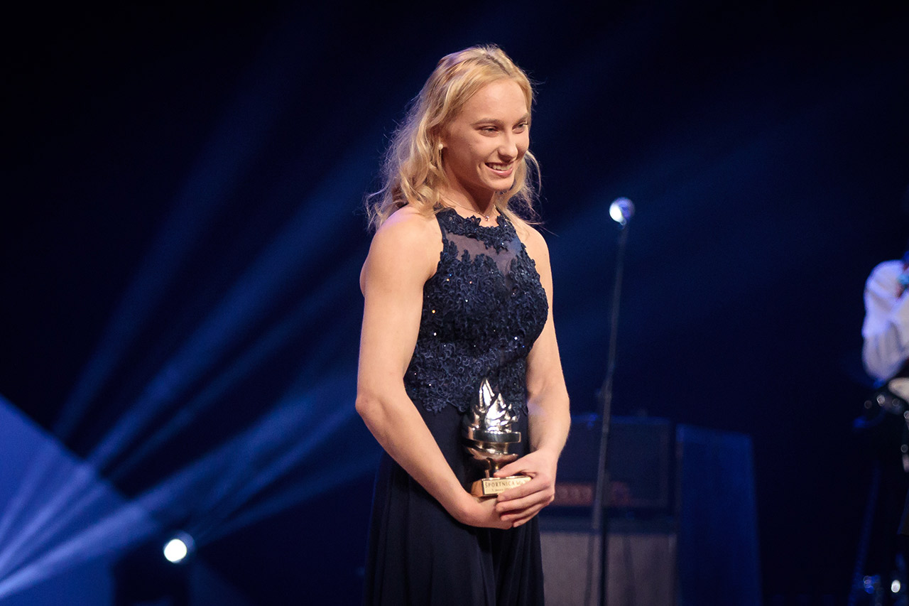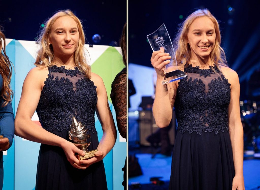 Poleg priznanja za naj športnico leta 2018, je Janja prejela tudi veliko statuo Olimpijskega komiteja Slovenije za uspehe na svetovnem prvenstvu. Foto: Sandi Fišer
