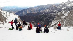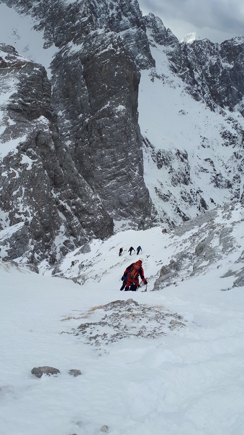 Tukaj palice zamenjamo za dereze in cepin, sneg je dobro predelan. Preplezamo skalni skok in nadaljujemo proti sedlu Gulce. Od sedla še slabe pol ure do vrha. Na vršnem delu  je snega malo, a ravno toliko, da je večina skal prekritih.  Pri sestopu smo dereze sezuli malo nižje, po prečenju hudourniških plazov Mali in Veliki Črlovec, saj je bila pot kljub malo snega zelo pomrznjena in nevarna za zdrs. Turo smo zaključili malo po 15 uri.