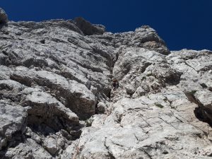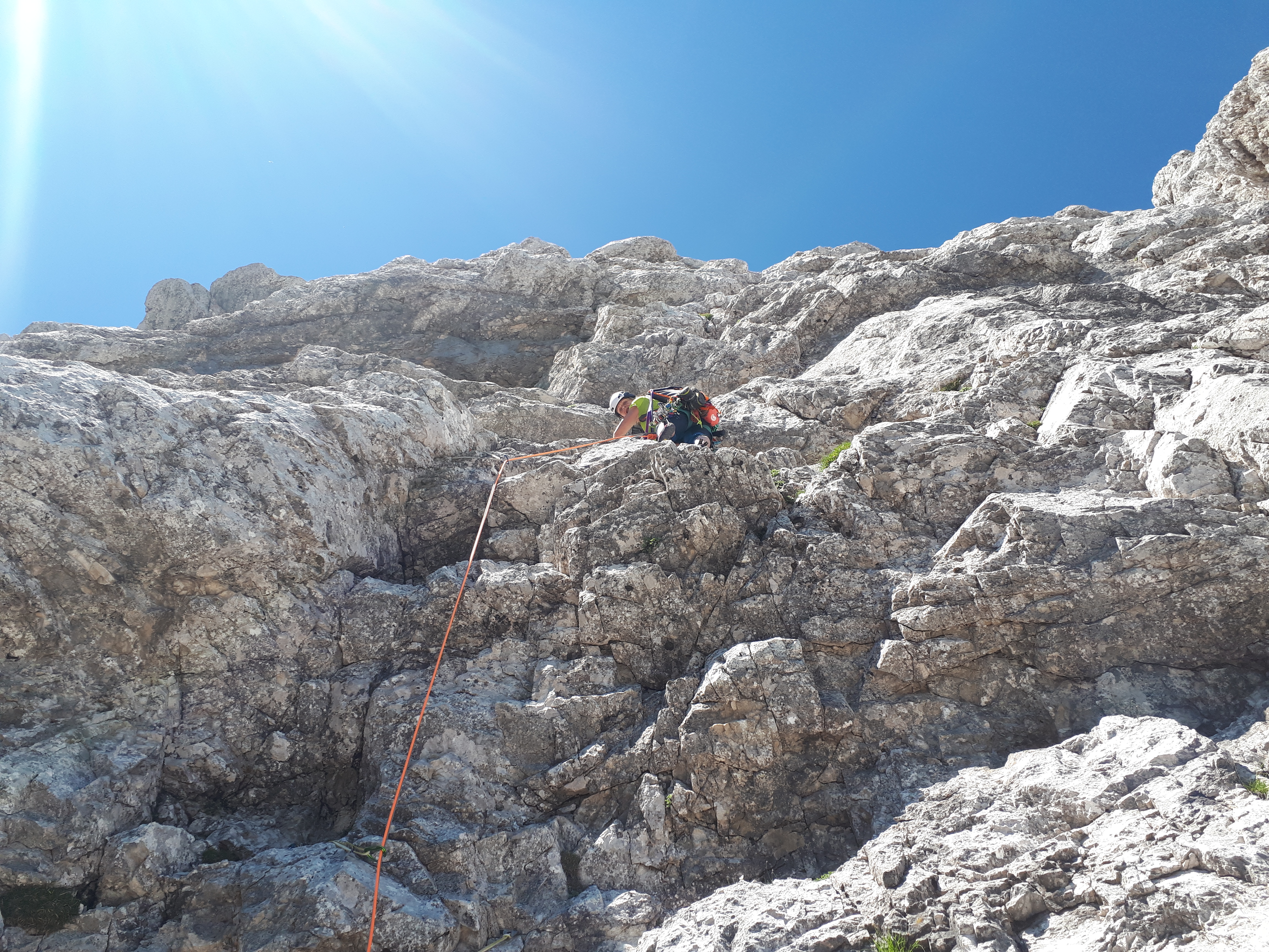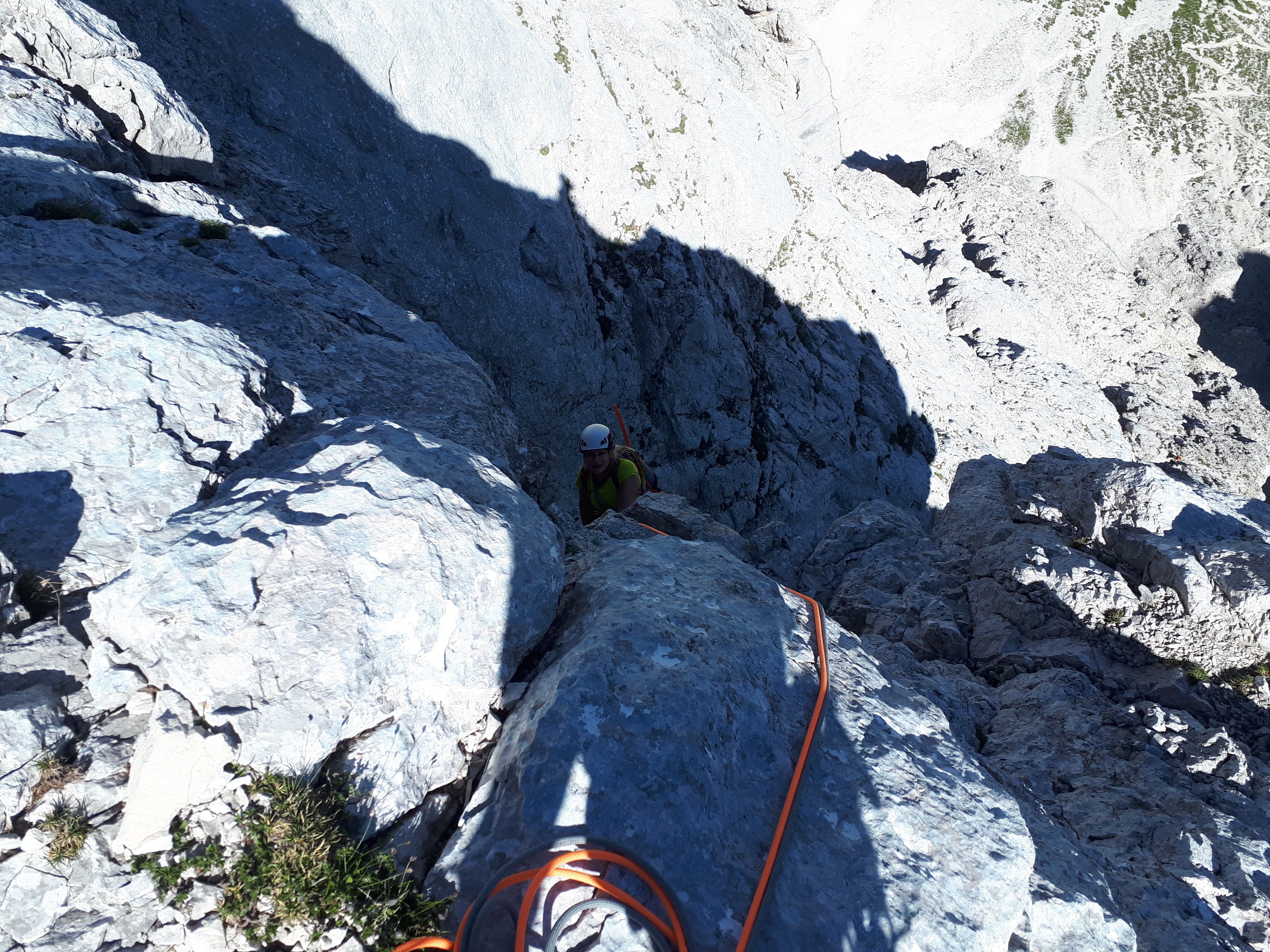 V nedeljo sva s Tanjo plezala v Mali Rinki. Zaradi lepega vremena je bilo v steni kar nekaj navez, vendar v najini smeri gneče ni bilo. V prvem raztežaju so grifi tu in tam obstali v rokah, naprej pa je bila krušljiva skala bolj kot ne navidezna. Smer je začinjena s tremi težjimi raztežaji, ki so sprva videti drugače, ampak ko jih plezaš kar nekako gre. V prvih treh raztežajih so urejena sidrišča za spust, smer pa je od lani tudi bogatejša za kakšen klin.