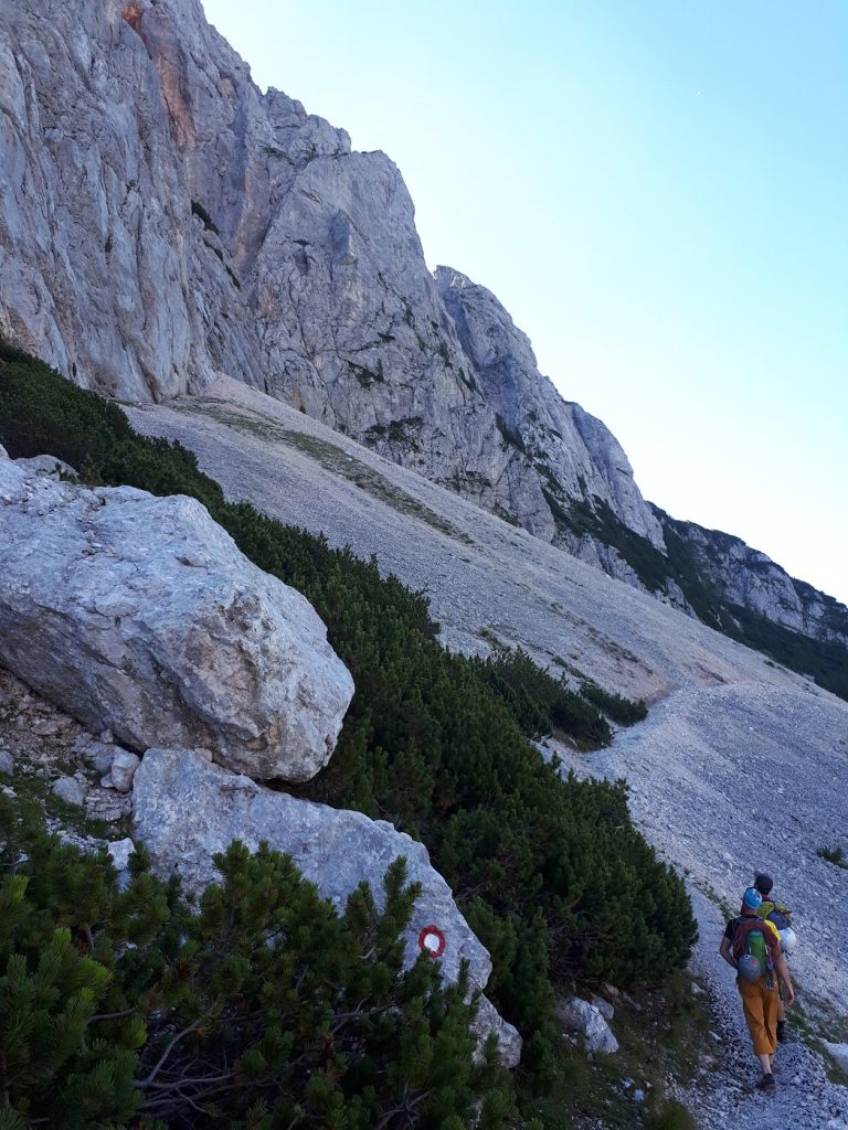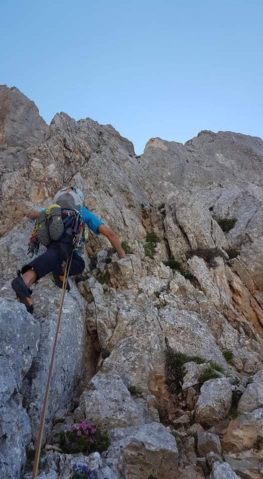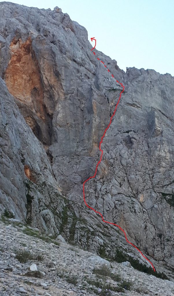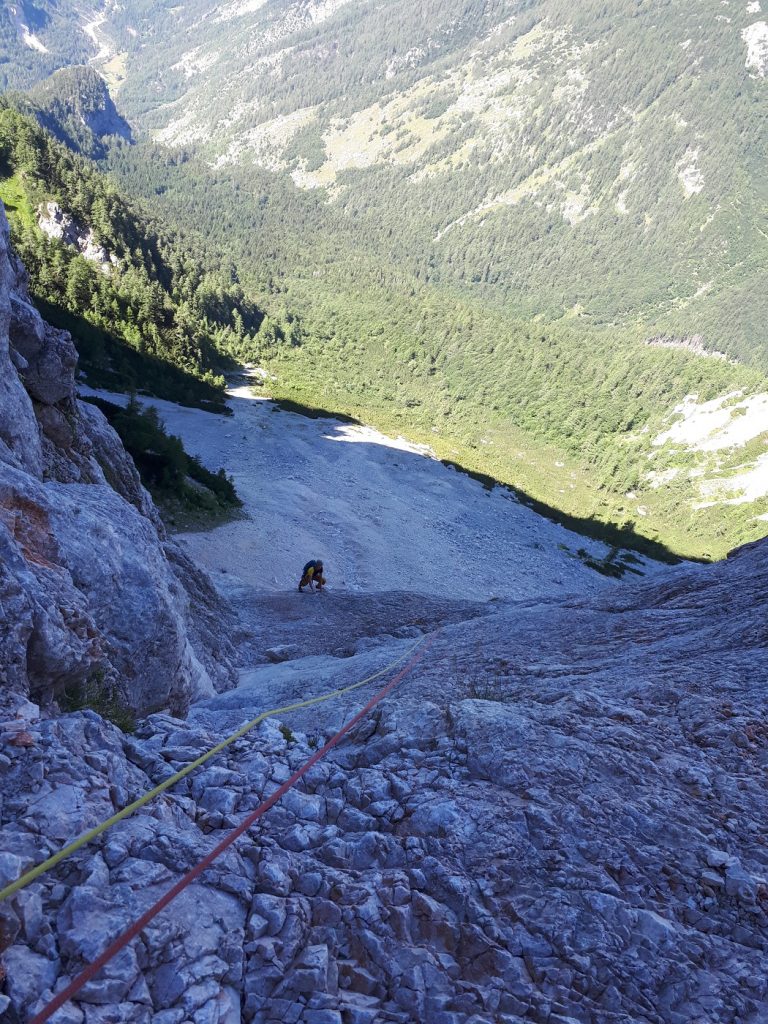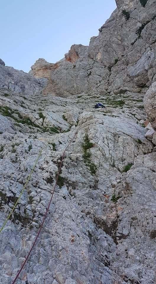 Po izstopu iz dveh težjih raztežajev smo kot manj izkušena naveza varovali še tri raztežaje po sicer lažjem, a krušljivem svetu, nato pa je sledilo še kakšnih 200 metrov izstopa iz smeri po travnati polici in ob gruščnatem žlebu. Za vzpon smo potrebovali 5 ur in pol vključno z spustom iz zajede in z izstopom.