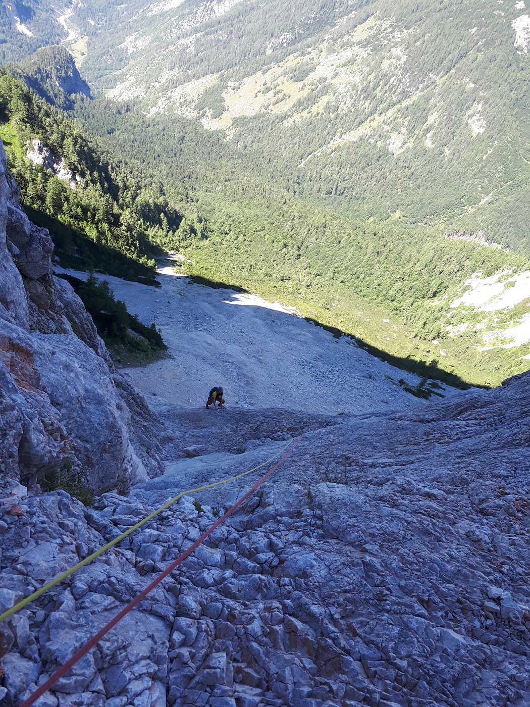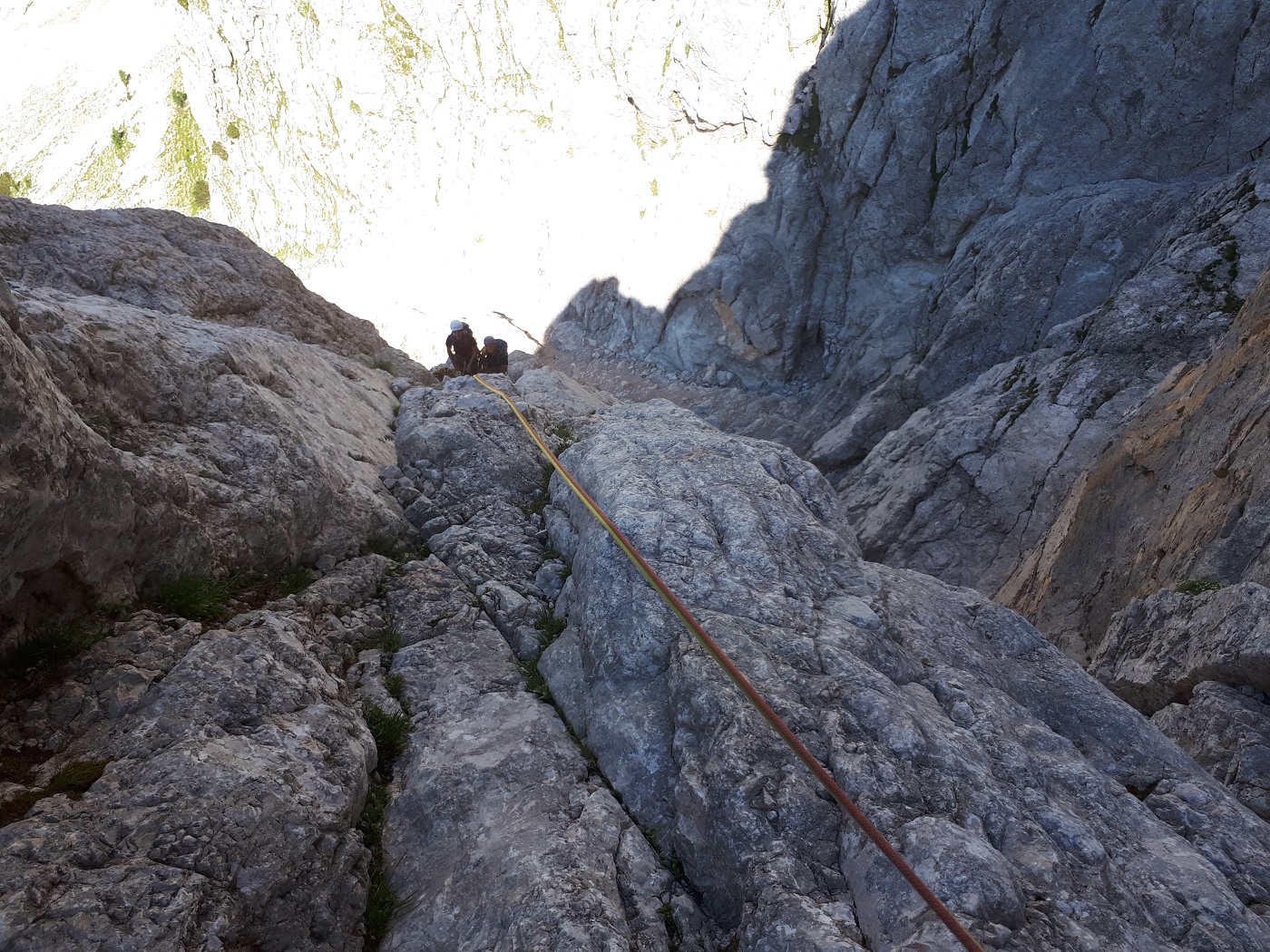 Po vstopnih kompaktnih ploščah smo do kotla splezali v dveh raztežajih po 60 metrov, tu smo našli tri obstoječe kline. Iz kotla nato nisem pravočasno zavil desno na raz in smo tako splezali kakšnih 70 metrov predaleč v kotel in nato v veliko zajedo. Očitno nismo bili prvi, ki so napravili takšno napako :), saj smo v zajedi našli sidrišče za spust na treh klinih. Stari prepereli prusik sem zamenjal z novim, vsi skupaj pa smo se nato spustili nazaj v dno kotla in poiskali prehod na varovališče na razu.