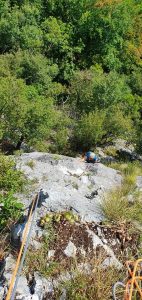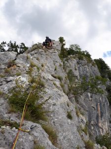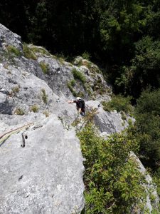 V soboto smo se, zaradi malo slabše vremenske napovedi v hribih, odločili, da gremo plezati na Kozjek. V Velenju smo se dobili Jure, Tanja, Nik, Miha in jaz in se skupaj odpeljali proti Socki, po poti pa smo pobrali še Luko. Ko smo se pripeljali do Socke smo že videli stene kamor smo bili namenjeni, ob pogledu v nebo pa smo se zavedali da nam bo še kako vroče. Ko smo prispeli do parkirišča, je nam tečajnikom, Jure veselo v roke potisnil opis dostopa in dodelil nalogo, da poiščemo izhodišča za današnjo plezanje. Vstope v smeri smo z nekaj manjšimi namigi inštruktorjev hitro našli, se razdelili po navezah, izbrali vsak svojo smer, se pripravili in začeli s plezanjem. Z Lukom sva najprej plezala Dišeče rože. Vse raztežaje sem plezal kot drugi in poslušal Luko kako je vriskal, ko je na vsakih nekaj metrov prijel za kakšno ne stabilno skalo ali martinčka. Smer je bila zelo lepa, tu in tam malo zaraščena in s posladkom (detajlom) v zadnjem raztežaju. Sestopila sva po gozdni potki ob melišču, desno od vrha smeri. Ko sva prišla nazaj pod steno, sva se odločila da splezava še Staro smer, katero sta pred nama plezala Nik in Tanja. Tokrat sem celotno smer plezal naprej. Tudi tukaj je bila plezarija lepa, smer je bila zelo lepo opremljena s klini, svedrovci in gurtnami, zato ni bilo potrebno nameščati dodatnih varoval. Ko sva priplezala na vrh mi je Luka čestital, nato pa sva se po že znanem sestopu spustila nazaj do izhodišča. Ker nama je bilo zelo vroče in sva bila že rahlo utrujena, sva sklenila da imava za ta dan zadosti plezanja. Pod steno sva počakala, da se iz nje vrnejo še Jure, Miha ,Tanja in Nik. Skupaj smo odšli do avtomobilov in na zasluženo pijačo, kjer smo malo poklepetali in nazdravili na Mihov rojstni dan.