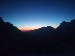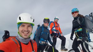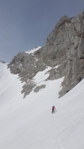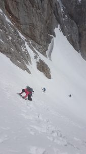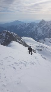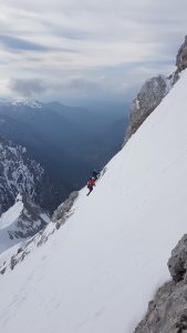 Budnica ob 04:00, zajtrk, kava in priprava stvari ter ob 05:05 štart od koče. Malo pred vstopom v Turski žleb se opremimo z zimsko opremo. Lepo napredujemo, glede na to, da prvi utiramo pot v sneg in malo pred sedmo uro smo na vrhu žleba. Nadaljujemo v smeri Skute. Preden zagrizemo v strmino Skute še pogledamo pot, ki nas čaka, in se malo okrepčamo. Do grebena so dobre razmere, nadaljujemo okoli skale čez napihan sneg, kjer je bilo potrebne nekaj previdnosti. Napredujemo z lepim tempom, a vseeno smo previdni na izpostavljenih mestih. V najtežjem delu si pomagamo s skalami in prečimo krajšo prečko. Sledi še nekaj deset metrov in ura je 8:35, ko smo na vrhu! Čestitamo si in si privoščimo zaslužen sendvič ter čaj. Sledi še spust po isti poti, kjer smo prišli. Le ta je zahteval malo več previdnosti in zbranosti zaradi vetra. Po spustu s Skute sledi še pot do Turskega žleba in spust po njem. Razmere so bile že slabše zaradi odjuge, na derezah so se že delale »cokle«. Ko prispemo do koče, si posušimo oblačila, nekaj pojemo, spakiramo stvari in odidemo v dolino na skutine štruklje. Skratka, odlično preživeta sobota v dobri družbi 😊.