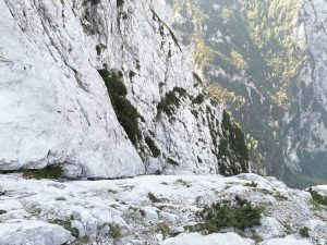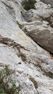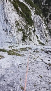 Po slabi uri prispemo do rumene pike (začetek smeri). Prva dva lažja raztežaja preplezamo nenavezani ter se pri začetku tretjega, pri platah, navežemo. Ker sta prva začela plezati Nik in Matej, sva z Moniko malo počakala in med tem spoznala še eno navezo, Domna in Mateja, iz AO Kamnik. Naslednja dva raztežaja potekata po res lepih navrtanih platah, kjer si lahko minimalno pomagaš z rokami. Nadaljujemo plezanje v dobri, kompaktni skali, kjer nam pride prav tudi kakšna “jebica“ ter “frend“ in tudi vreme je kot naročeno.