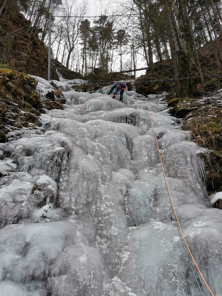 Najprej smo se odpravili do Slapu na Klemenči jami, do koder je bilo približno uro dostopa. Slap je bil mestoma dobro zalit, mestoma pa je bilo treba pogazit po snegu, ali pa pokrempat po skali. Za moj krstni slap pa prav simpatična izbira. Sestopili smo desno od izstopa iz slapu (in ne navzgor po grapi, ki je menda tudi ena od opcij). Pod steno smo se ustavili pri privlačnem slapu Kiks, zanj sta se odločila Jure V. in Matej, ostali pa smo po drugi slap odšli v dolino. Ker je bil Palenk v gužvi in precej tekoč, smo se odpeljali do Avtoceste, ki je bil lepo zalit, zgornji del do abzajl drevesa pa smo popikali kar po zemlji. Za spust je bil dovolj en abzajl, z nekaj metri poplezavanja navzdol ob novi železni ograji.