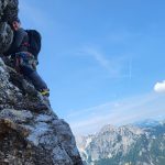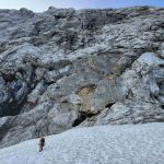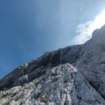 V zadnjem delu stene plezarija postane manj zahtevna in zares uživam. Predvsem v zadnjem raztežaju, kjer je dobrih oprimkov na pretek. Na vrhu stene kjer se priključimo Kopinškovi poti je nekaj snežišč, vendar se jim je možno izogniti po spodnji strani.