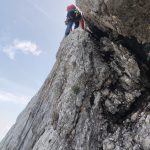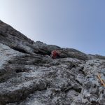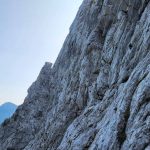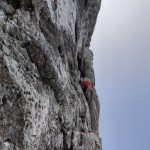 Višje na izraziti gredi, kjer se ta konča zavijeva levo v ozek kamin. Tukaj mi cepin na nahrbtniku dela kar nekaj preglavic. Če bi lahko bi ga “zagnal” naravnost v dolino. Nato pade par krepkih besed in že se prebijem po žlebasti gredi do Nejca na sidrišče. Zelo izpostavljen raztežaj.