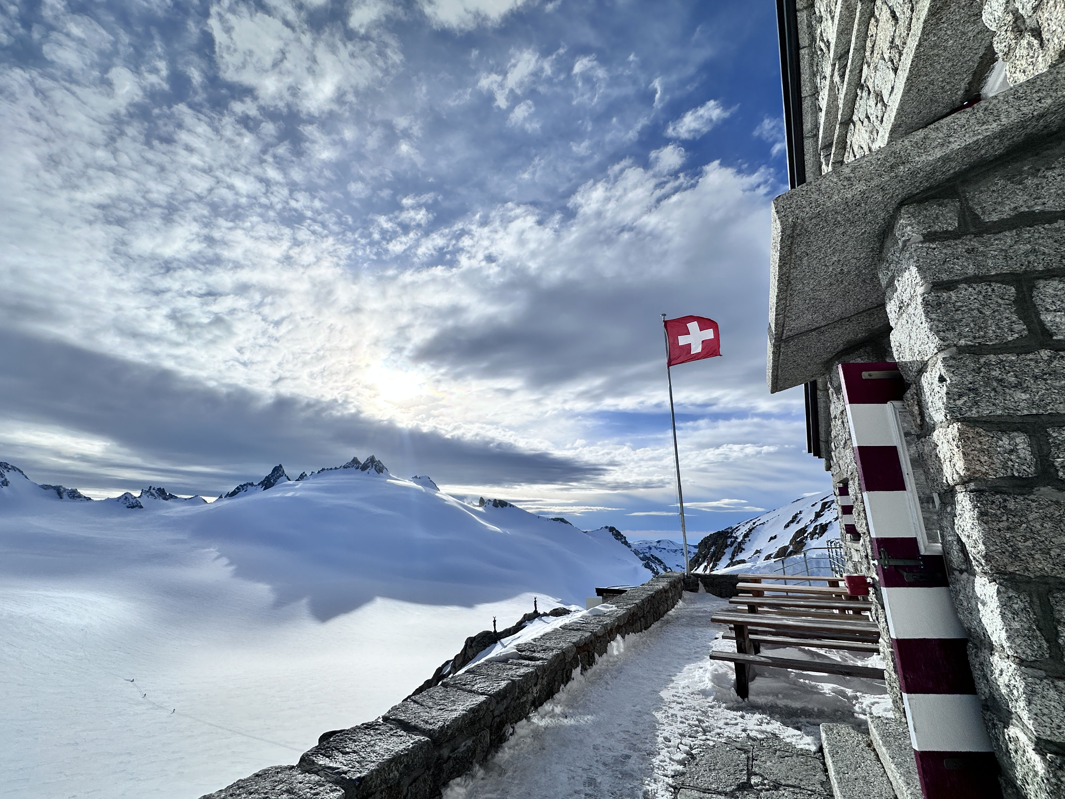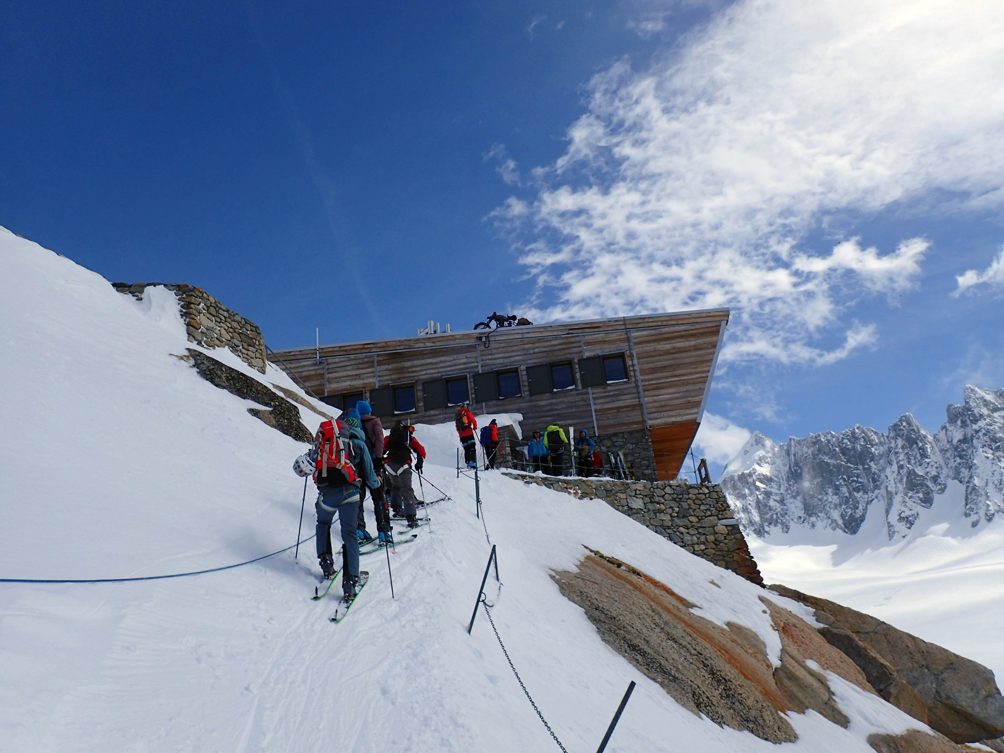 Naslednjih pet nočitev je bilo v kočah Argentiere (FR), Trient, Prafleuri, Dix in Vignettes (CH), vmes pa šest dnevno prečenje na smučeh ali derezah. Tretji dan visoka pot preči dolino, v Verbieru smo to izkoristili za dopolnitev zalog malice in pa dobro kavo. Ritem dni od koče do koče je bil vsak dan enak, zgodnje vstajanje in zgodnje spanje. Koče so prijetne, večerje dobre in obilne, zajtrk sicer malo špartanski. Nekatere koče imajo tekočo vodo, nekatere ne, Trient pa celo tuš na žetone. Signal in WiFi je tudi redkost, zato smo se pa bolj intenzivno družili v prostem času 😊